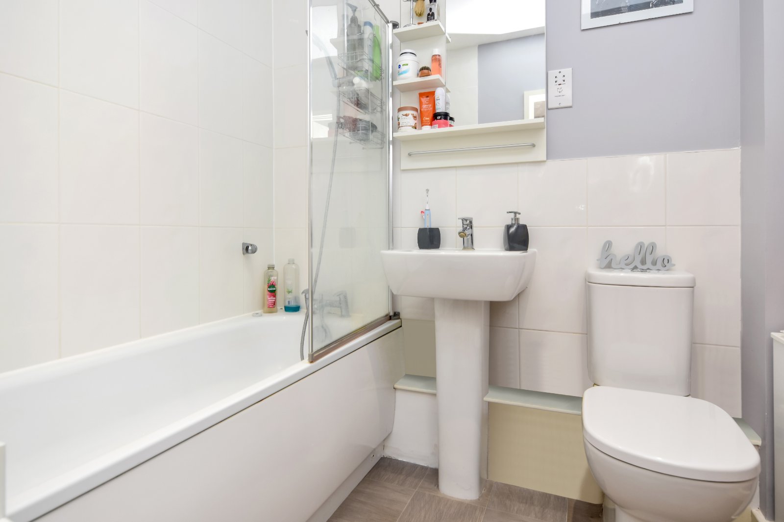 The modern white three-piece suite comprises a panel-enclosed bath with mixer tap and handheld shower attachment, complemented by a fitted glass shower screen. There is a dual-flush WC and a pedestal wash hand basin with mixer tap, set beneath a wall-mounted mirror with integrated shelving. Additional features include a shaver point, tiled flooring, partly tiled walls, and a ladder-style heated towel rail. The smooth ceiling incorporates recessed lighting and an extractor fan.
