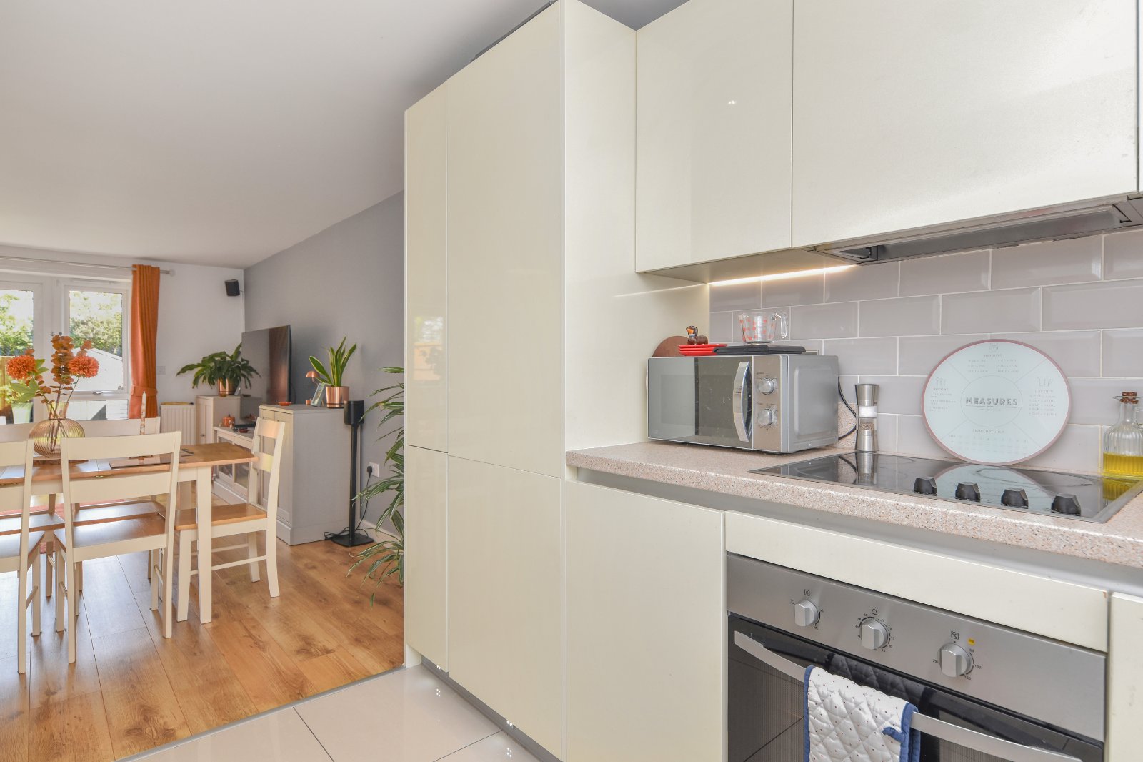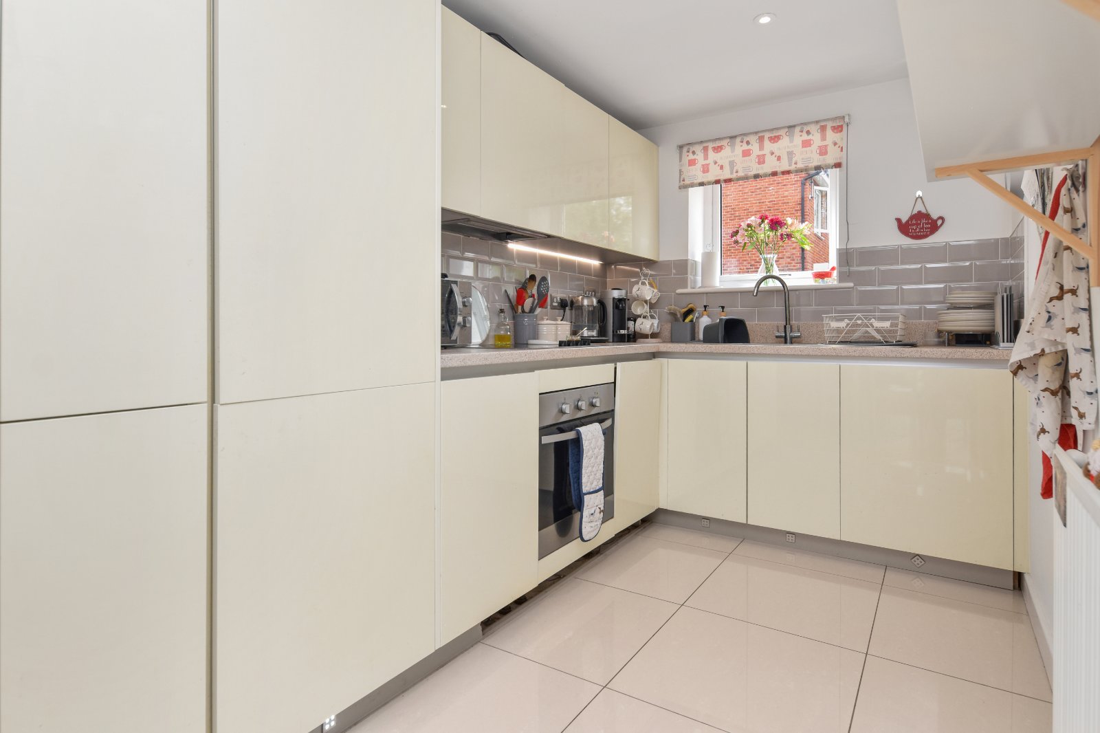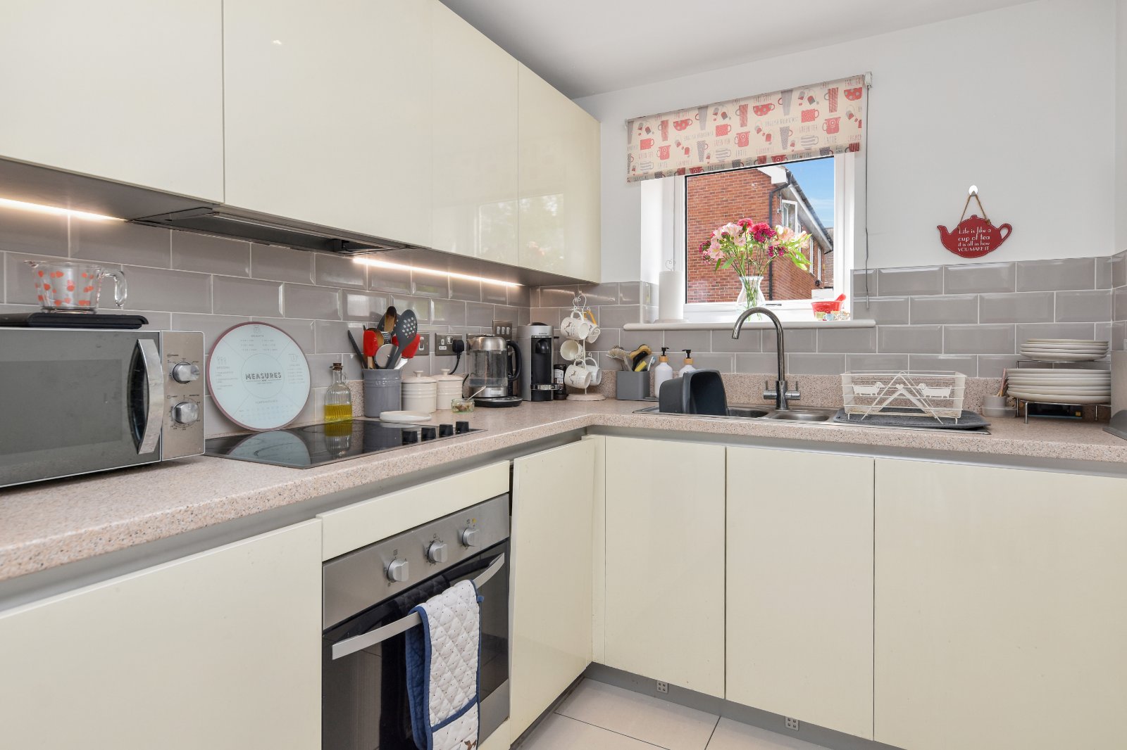 A stylish, modern kitchen enjoying good natural light from a front-facing double-glazed window. The space is appointed with a range of contemporary wall and base units, complemented by square-edge work surfaces, matching upstands and metro-style tiled splashbacks. A stainless steel one-and-a-quarter bowl sink with mixer tap is positioned beneath the window, alongside integrated appliances including an oven, four-ring hob with extractor above, plus under-counter dishwasher and washing machine. Further features include under-cabinet lighting, a radiator, high-gloss tiled flooring, and a smooth ceiling with inset spotlights.