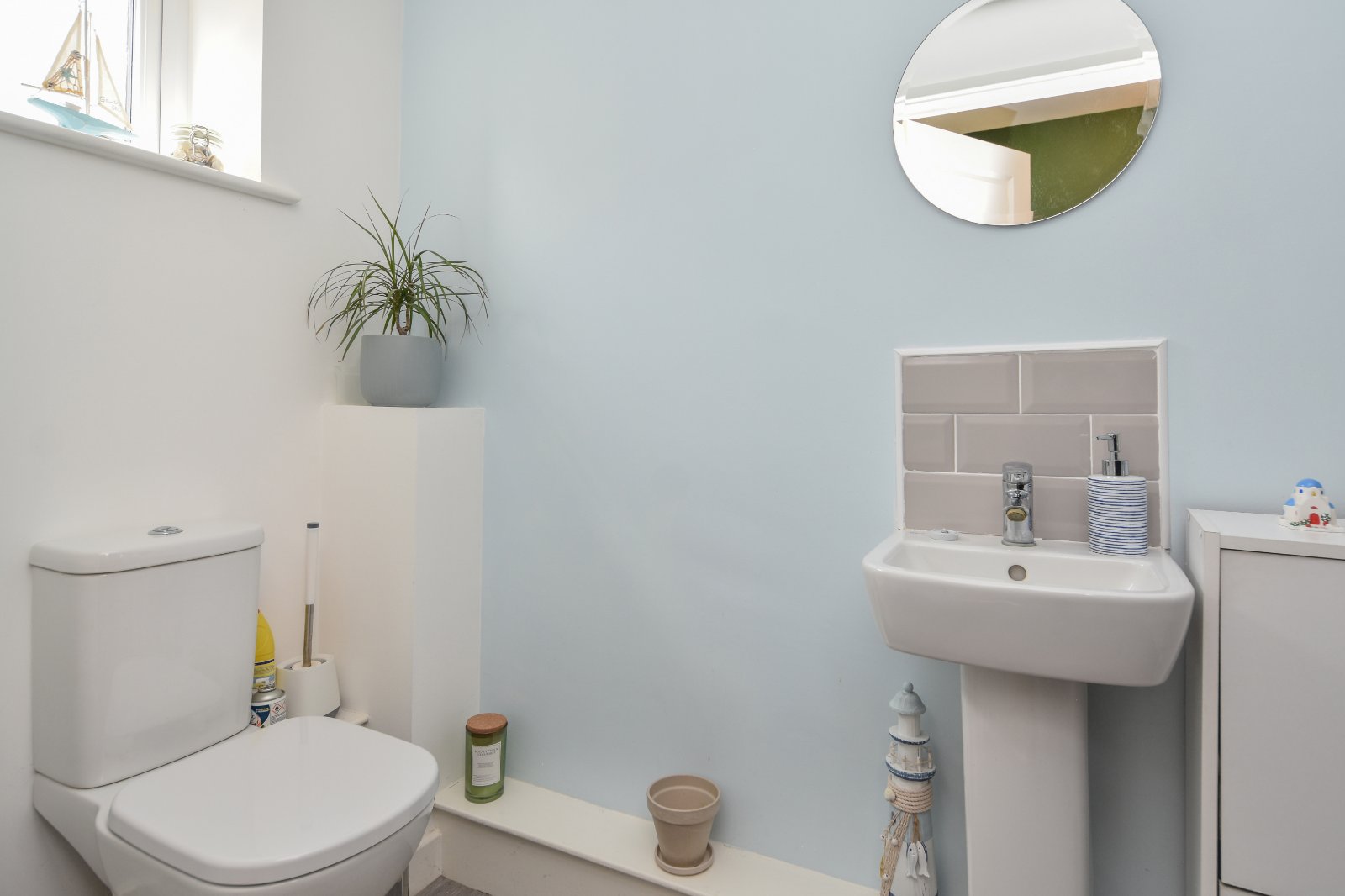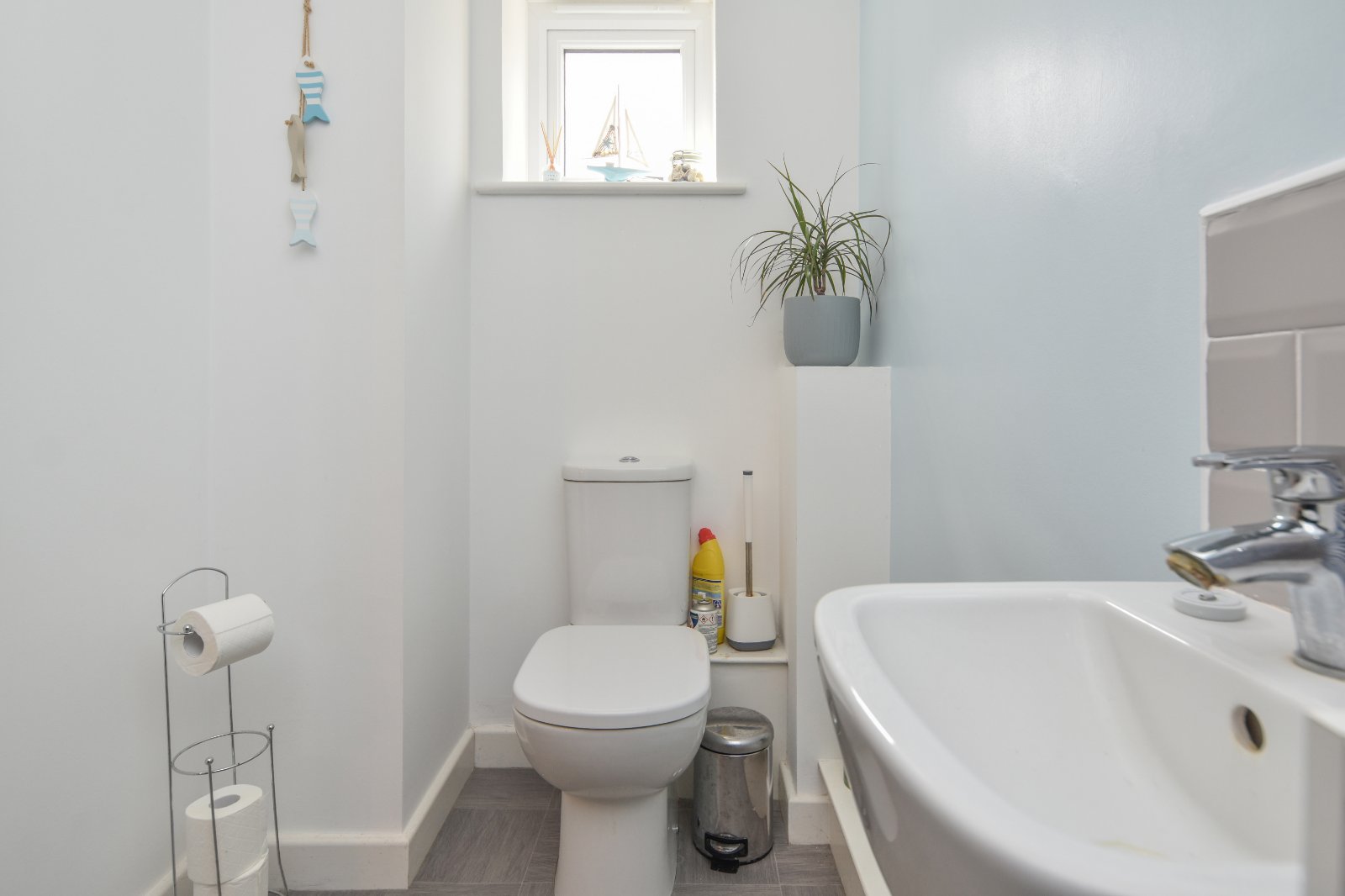 A bright ground floor cloakroom with a high-level obscure uPVC double-glazed window to the front aspect. Fitted with a modern white suite comprising a pedestal wash hand basin with mixer tap and metro-style tiled splashback, alongside a low-level dual-flush WC. Additional features include tiled flooring, a chrome ladder-style heated towel rail, and a smooth ceiling with inset spotlights and extractor fan.