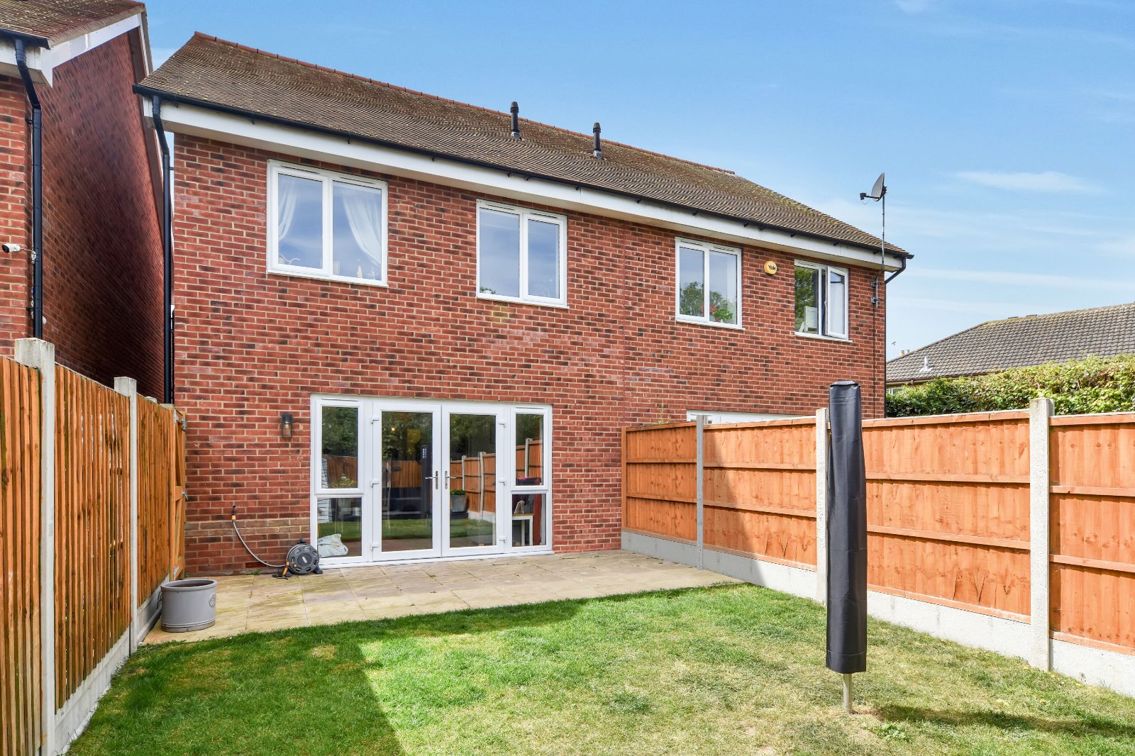 The property benefits from a neatly maintained and well-proportioned rear garden, designed for ease of upkeep. A paved patio area adjoins the rear of the house, providing space for outdoor seating and entertaining, leading onto a level lawn.
