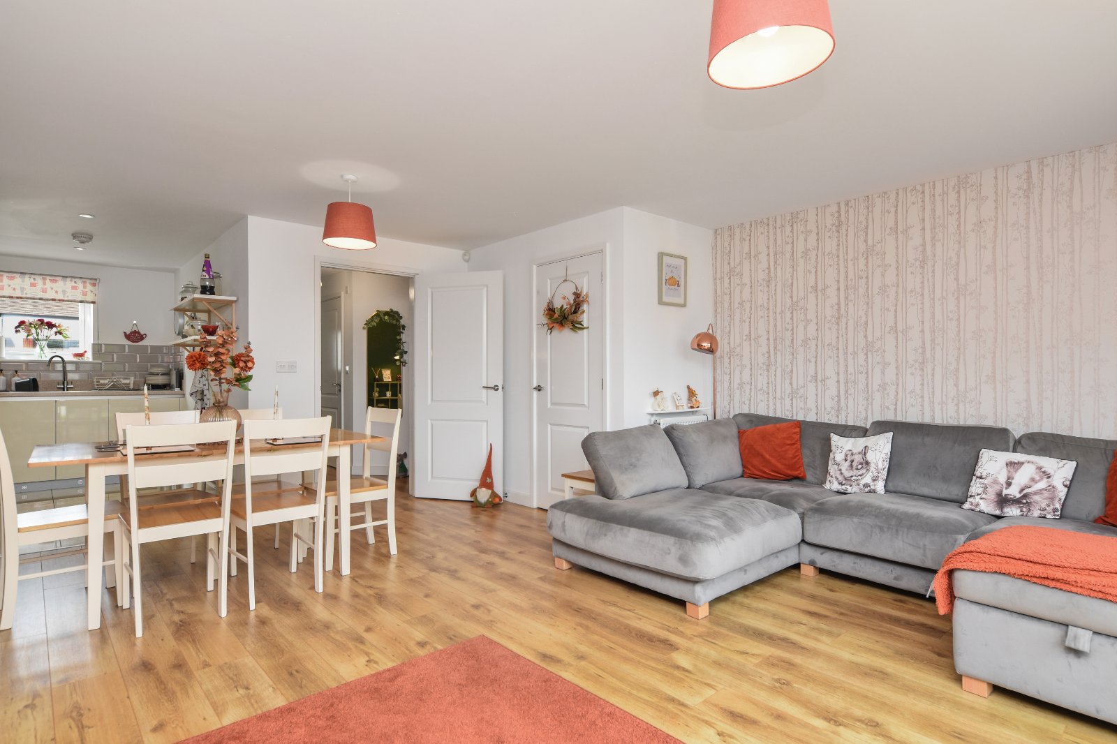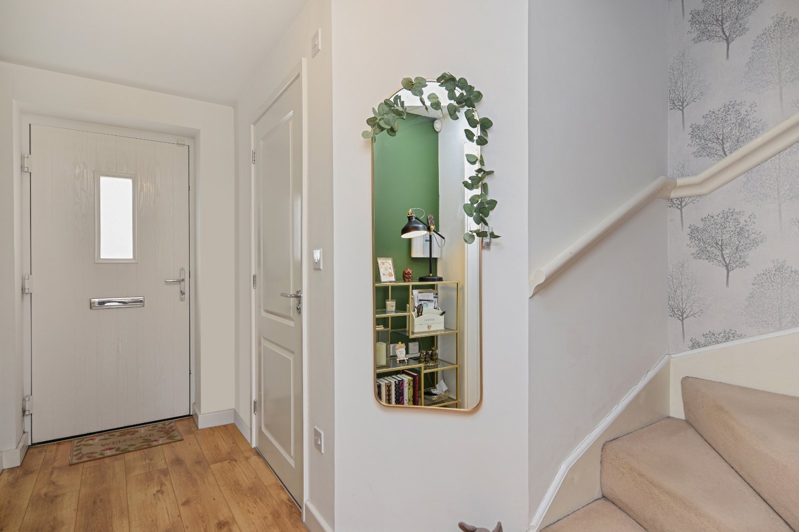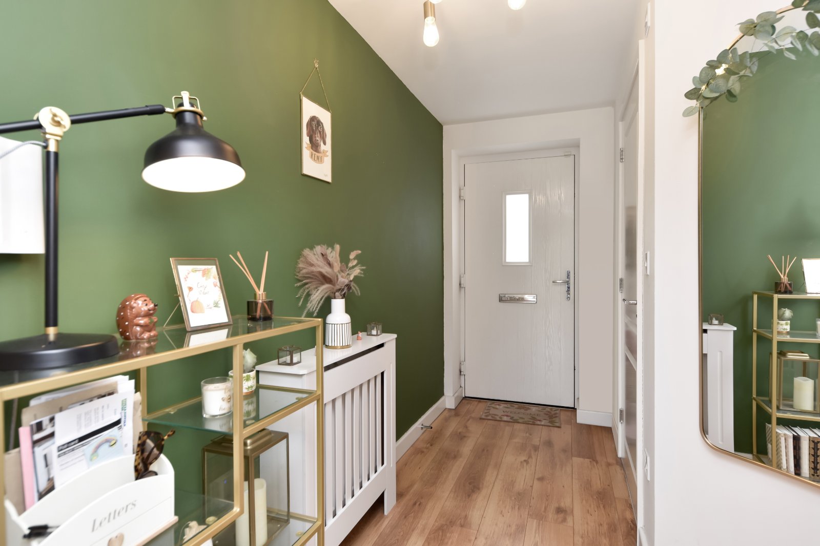 Approached via an attractive courtyard environment, the home enjoys the advantage of two designated parking spaces. A glazed canopy shelters the entrance, where a composite door with obscure double-glazed panel provides access into the property.