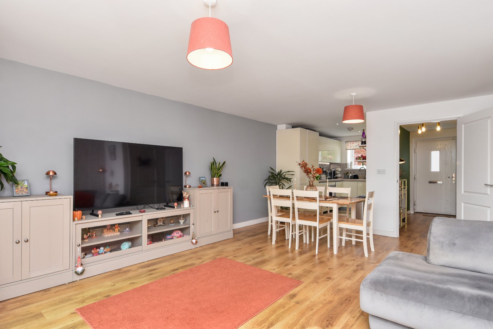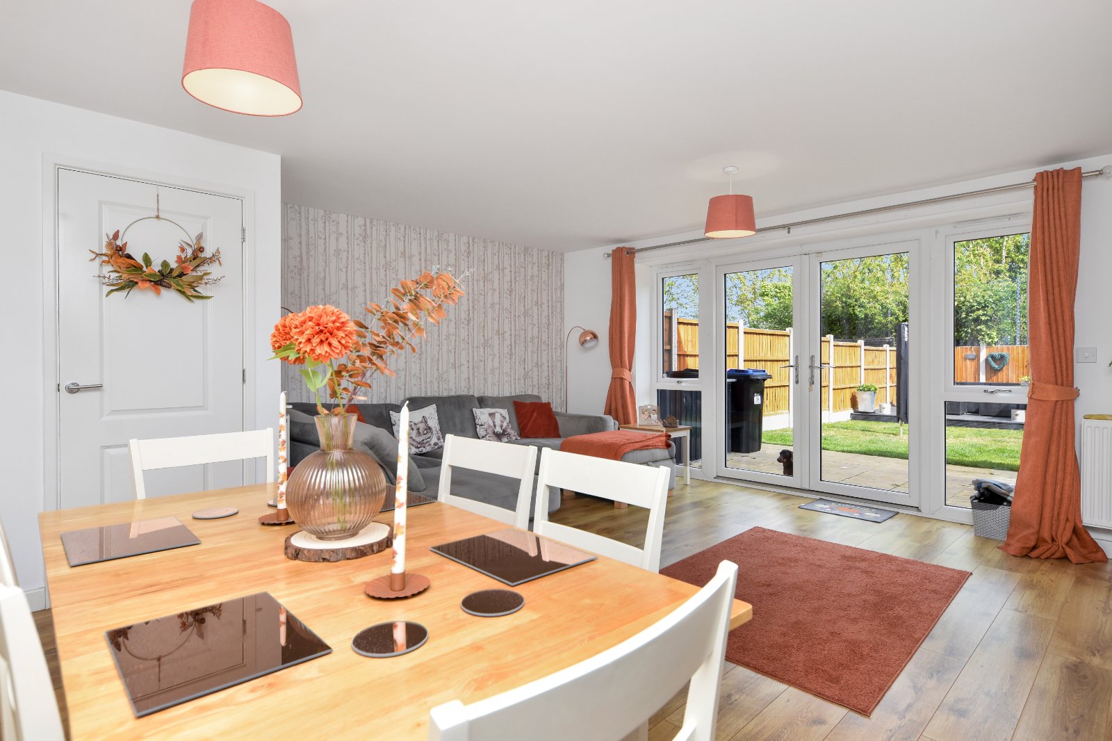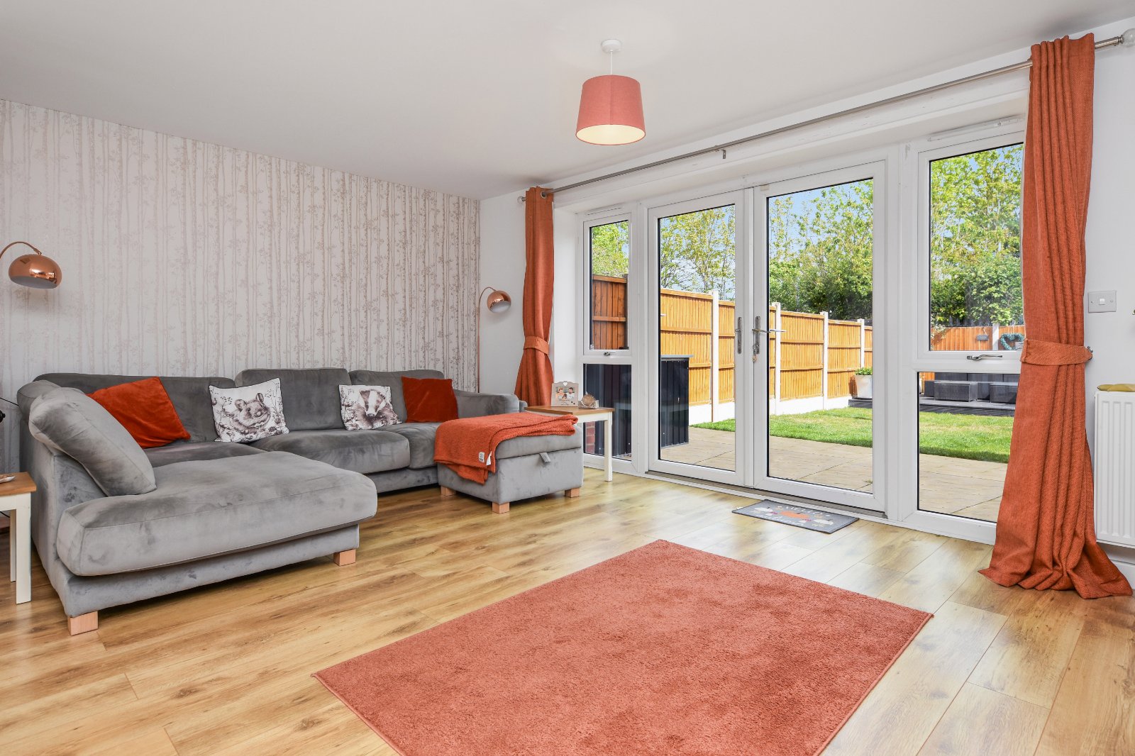 A spacious open-plan living area, bright and welcoming, with uPVC double-glazed French doors and side panels opening onto the garden. Two radiators, wood-effect flooring, and a smooth ceiling enhance the space, with a panelled door leading to a handy under-stairs storage cupboard. The layout flows effortlessly through to: