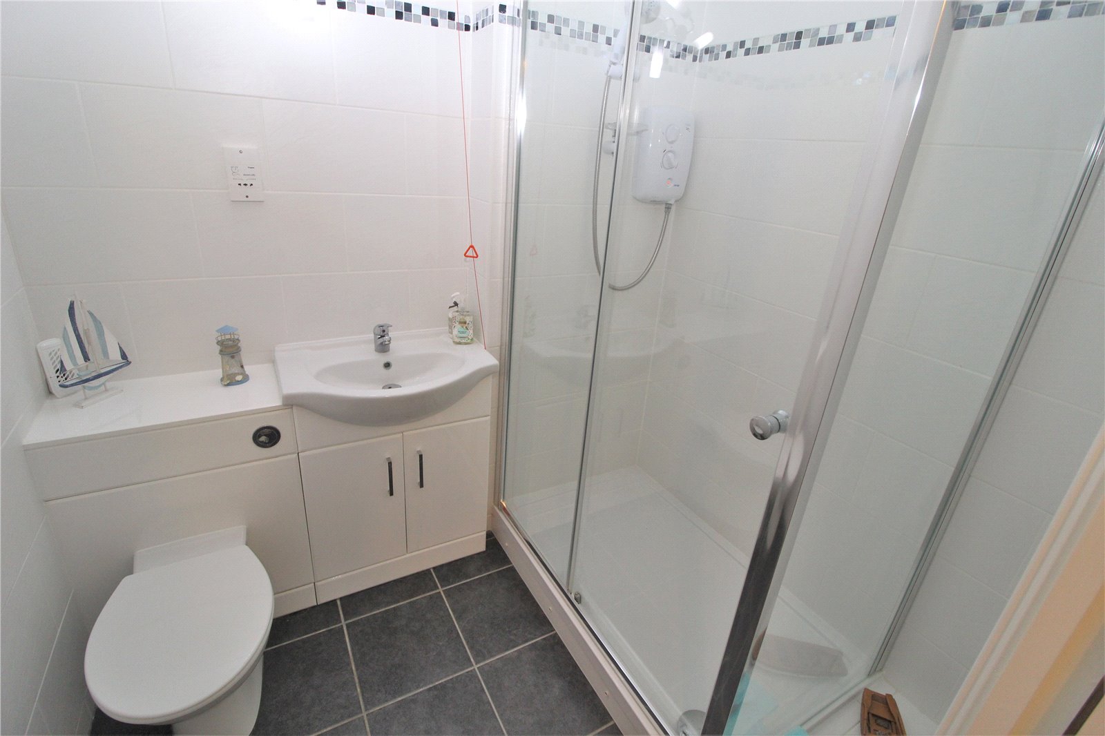 Fitted with a modern white three piece suite comprising of low level w.c with concealed sistern, vanity wash hand basin with stainless steel mixer tap and cupboard under, tiled shower cubicle with wall mounted electric shower unit sliding doors. Shaver point. Tiling to walls. Extractor fan. Coved cornicing with textured ceiling. Ceramic tiled floor. Heated towel rail. Emergency pull cord.