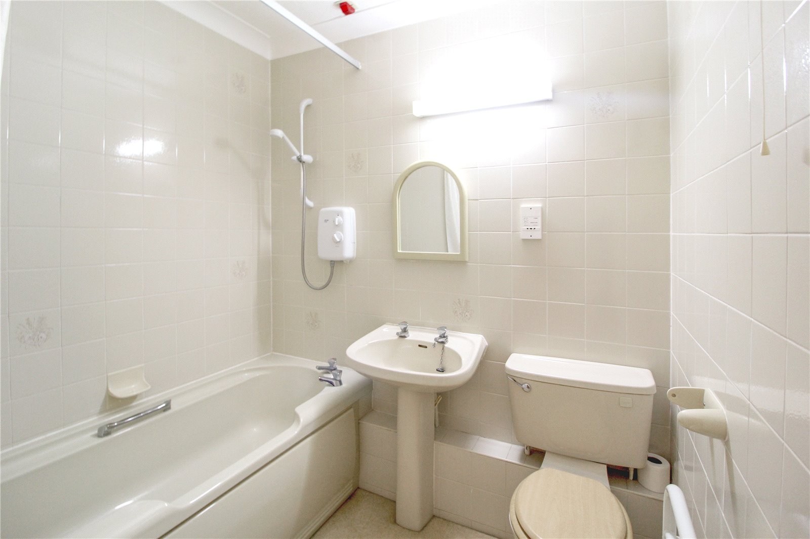 Lino to floor, stippled ceiling, strip light, bath with shower over, sink, WC, towel rail.