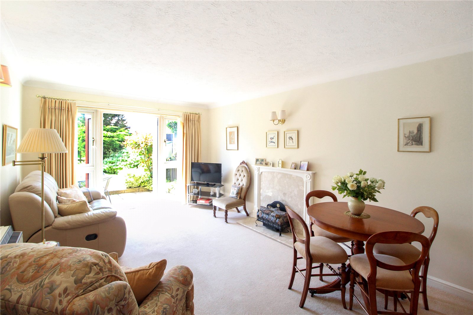 Large, bright and airy room, with double double glazed doors and two x double glazed windows adjacent, carpet to floor, wall lights, large understairs storage cupboard, electric log burner, radiator.