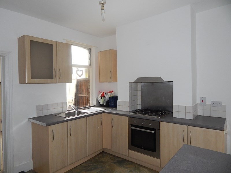 Kitchen/ Diner 11'3 >10' x 9'9 (3.43m >3.05m x 2.97m ) Smooth plastered ceiling, window to rear elevation, double radiator, range of base and wall mounted storage units with matching drawers and feature glass fronted display cabinet, roll edge work surfacing with tiling above and inset single drainer stainless steel sink unit with mixer tap, built in oven and hob with extractor hood above, understairs storage cupboard, laminate wood effect flooring, door leading to:-
