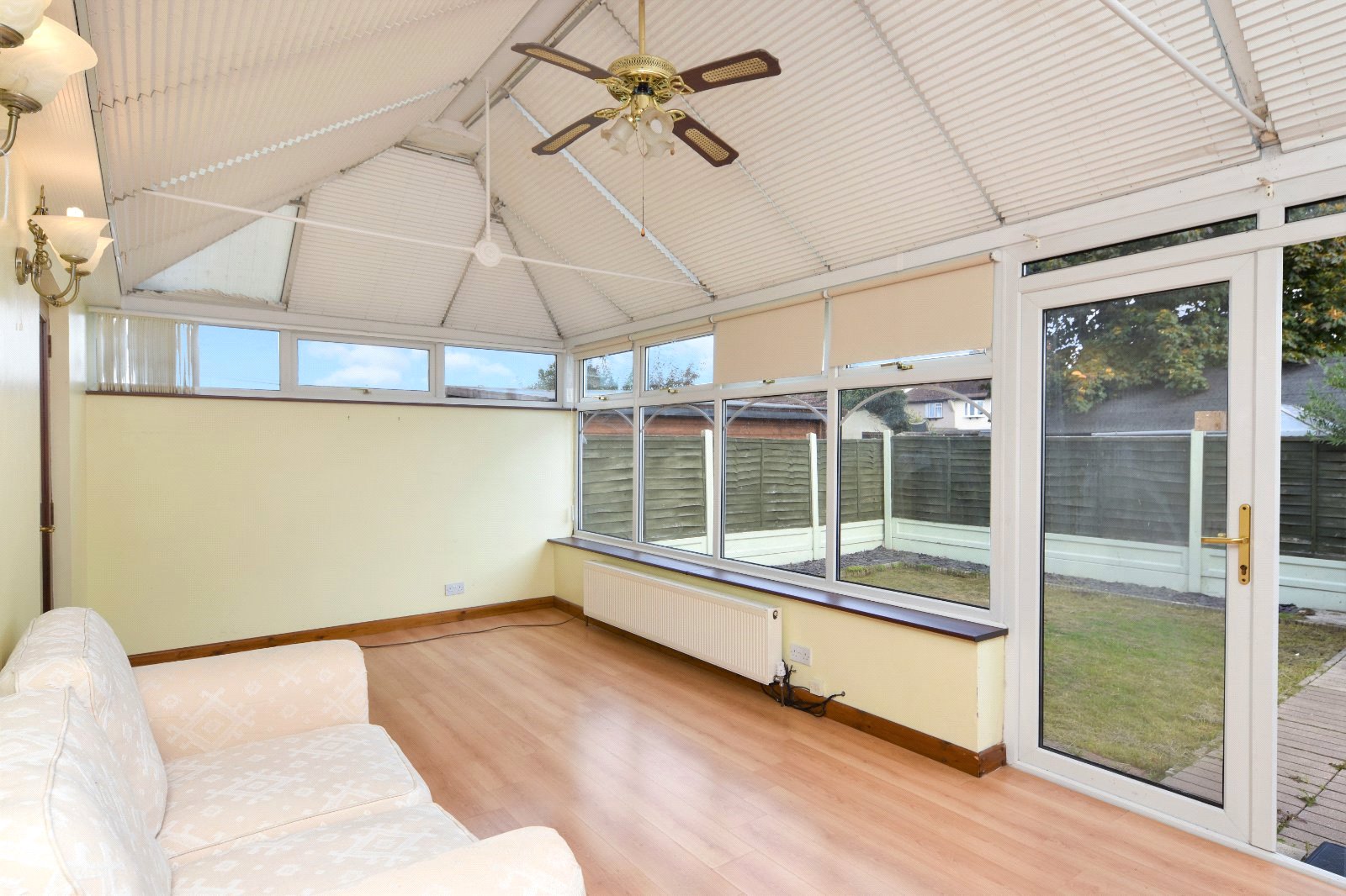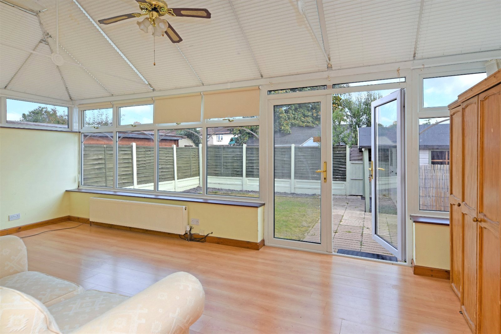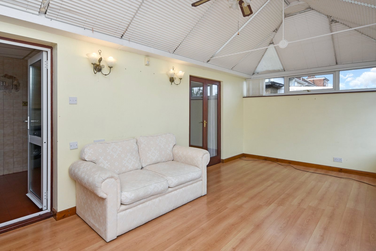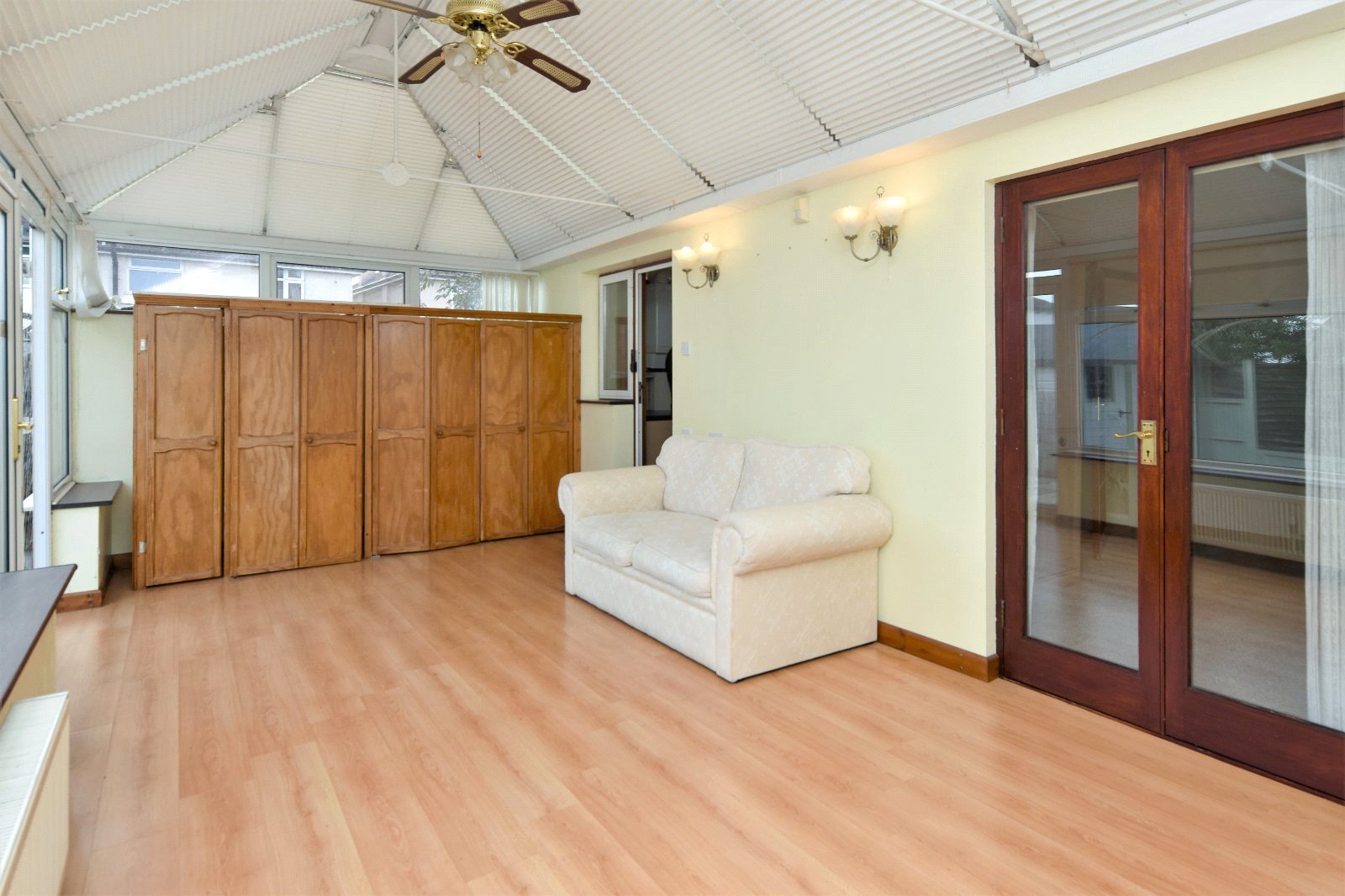 uPVC double glazed windows to side and rear aspect inset with a pair of french doors opening to the Garden. Further high level uPVC double glazed window to side aspect. Pitched polycarbonate roof inset with ceiling mounted fan. Radiator. Cupboard doors concealing full height 'Beko' fridge & full height 'Beko' freezer (both to remain). Wall light points. Laminate wood flooring. Pair of doors to main Bedroom.