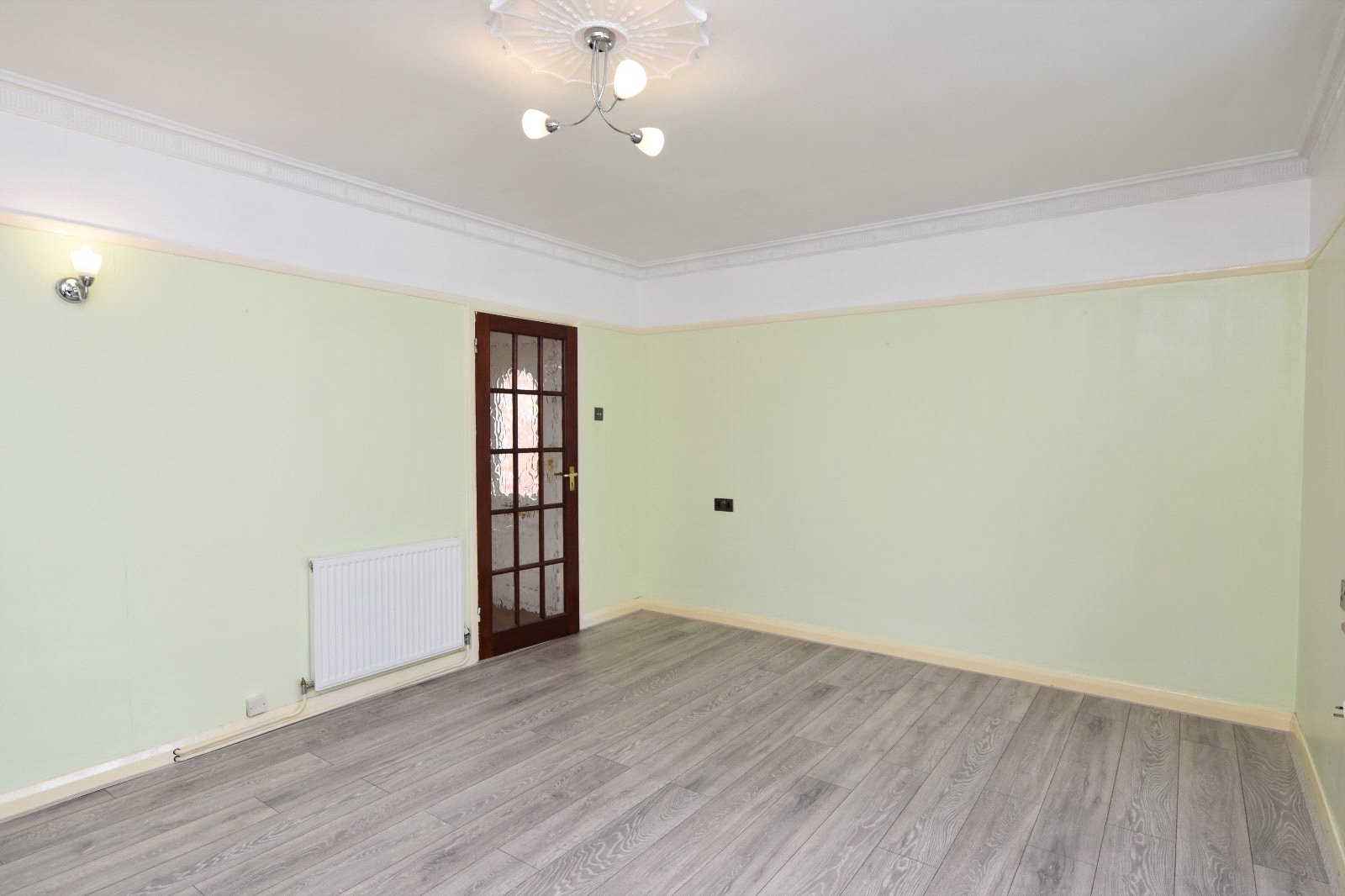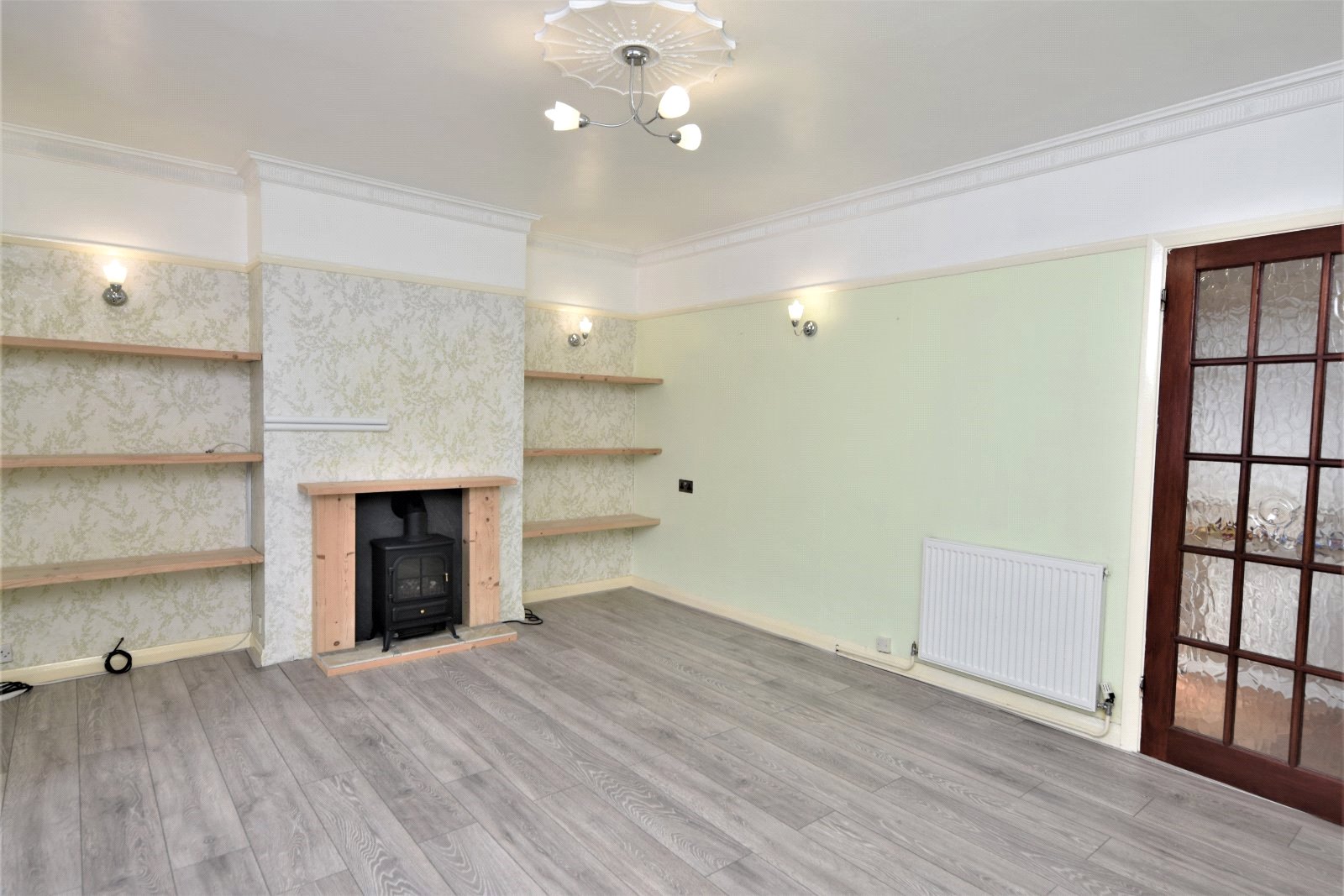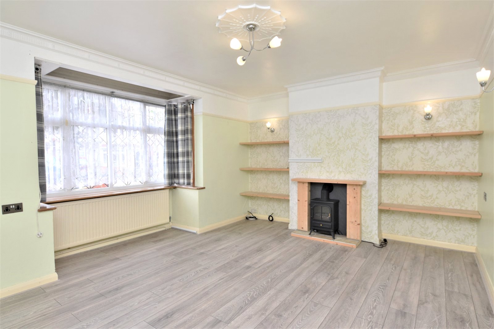 uPVC double glazed bay window to front aspect. Fireplace surround with mantle over inset with freestanding electric stove/burner. Fitted shelving. Wall light points. Laminate wood flooring. Radiator. Picture rail. Cornice to smooth plastered ceiling inset with moulding and ceiling mounted fan.