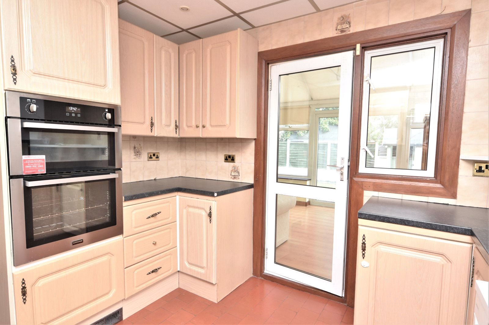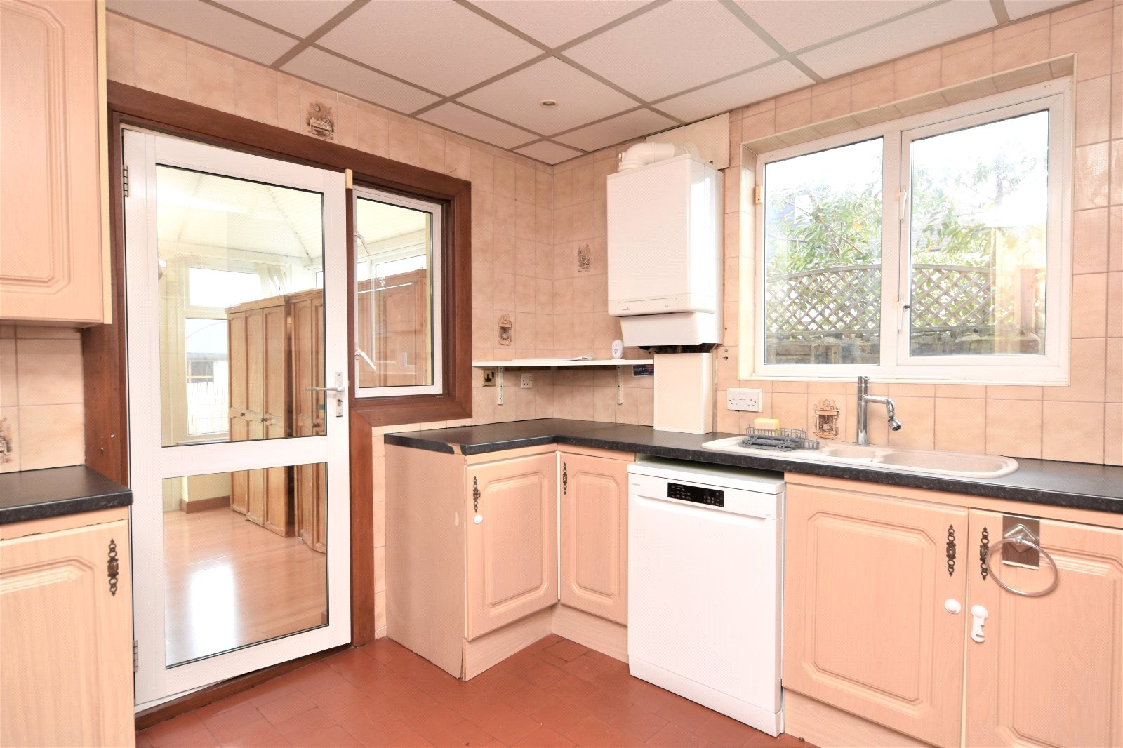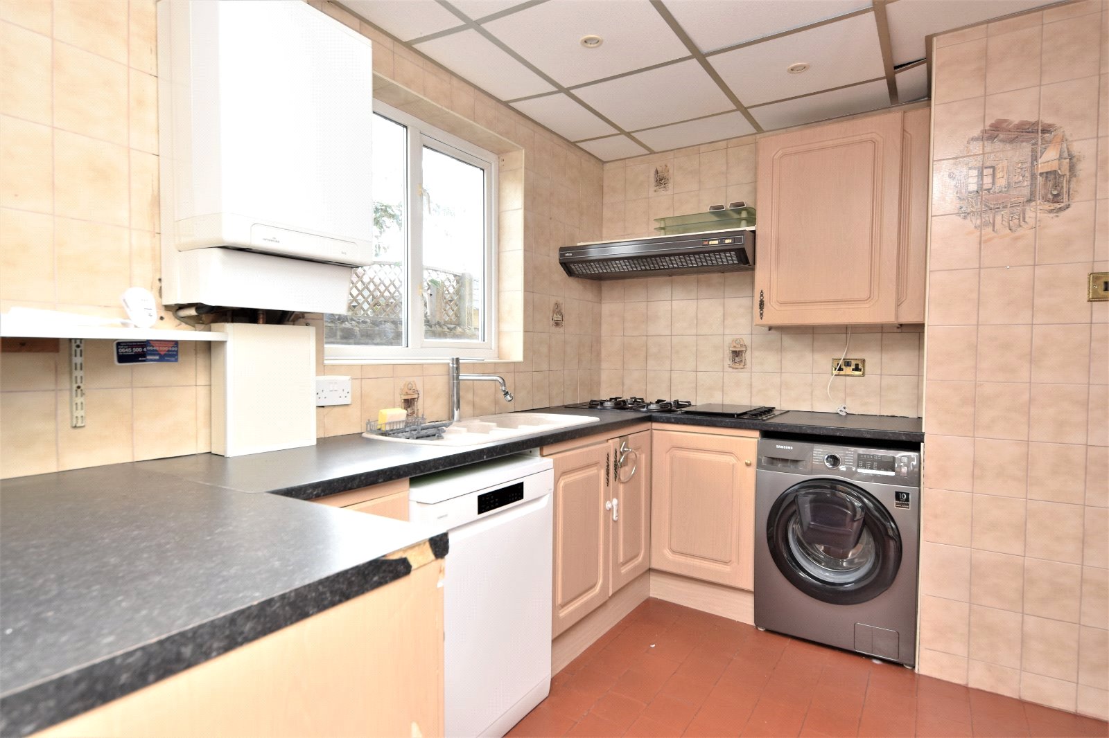 uPVC double glazed window to side aspect. The Kitchen is fitted with a range of eye and base level units with rolled edge working surfaces over inset with one-and-a-quarter single drainer sink unit with mixer tap over. Built in 'Stoves' double gas oven. Split level 'Canon' four ring gas hob with griddle with full width extractor canopy over. Under counter washing machine (to remain). Undercounter 'Kenwood' dishwasher (to remain). Wall mounted boiler. Quarry style flooring. Tiling to all visible walls. Suspended ceiling. (Agents Note - the sellers has advised that the oven was replaced at the binning of 2022 and the washing machine is approximately 18 months old). Further double glazed window to rear with matching door providing access to;