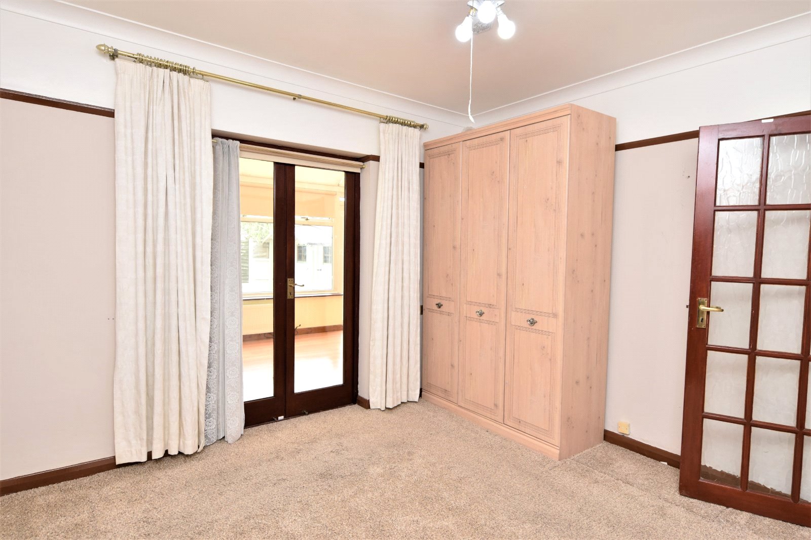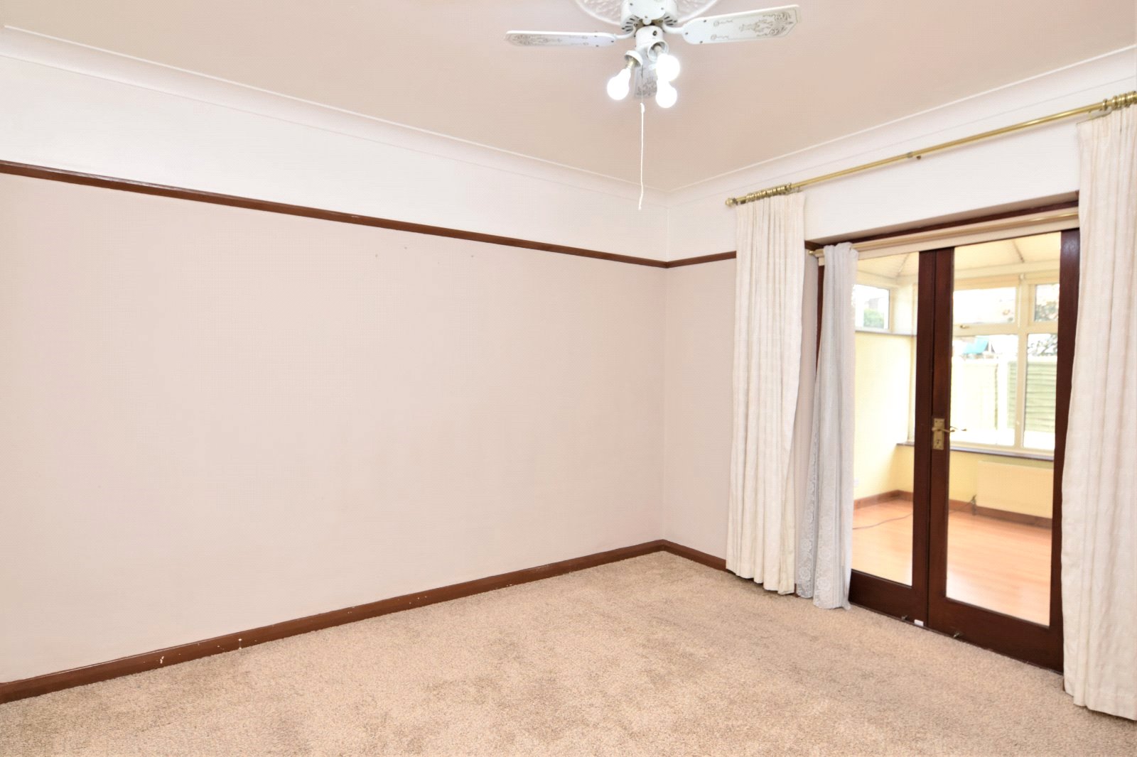 Pair of double glazed french doors opening to the Conservatory. Freestanding wardrobe (to remain). Radiator. Picture rail. Cornice to smooth plastered ceiling inset with moulding and ceiling mounted fan.