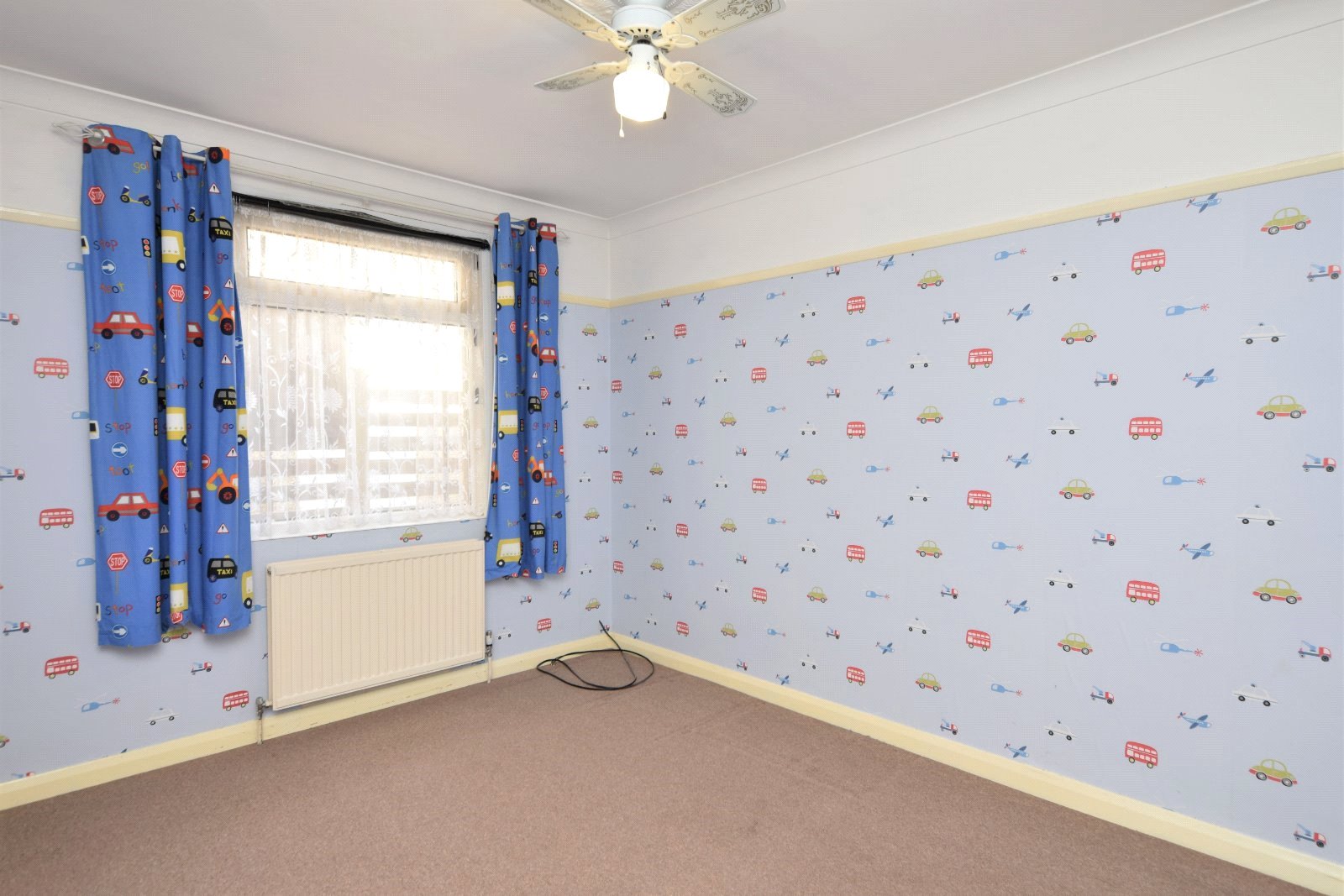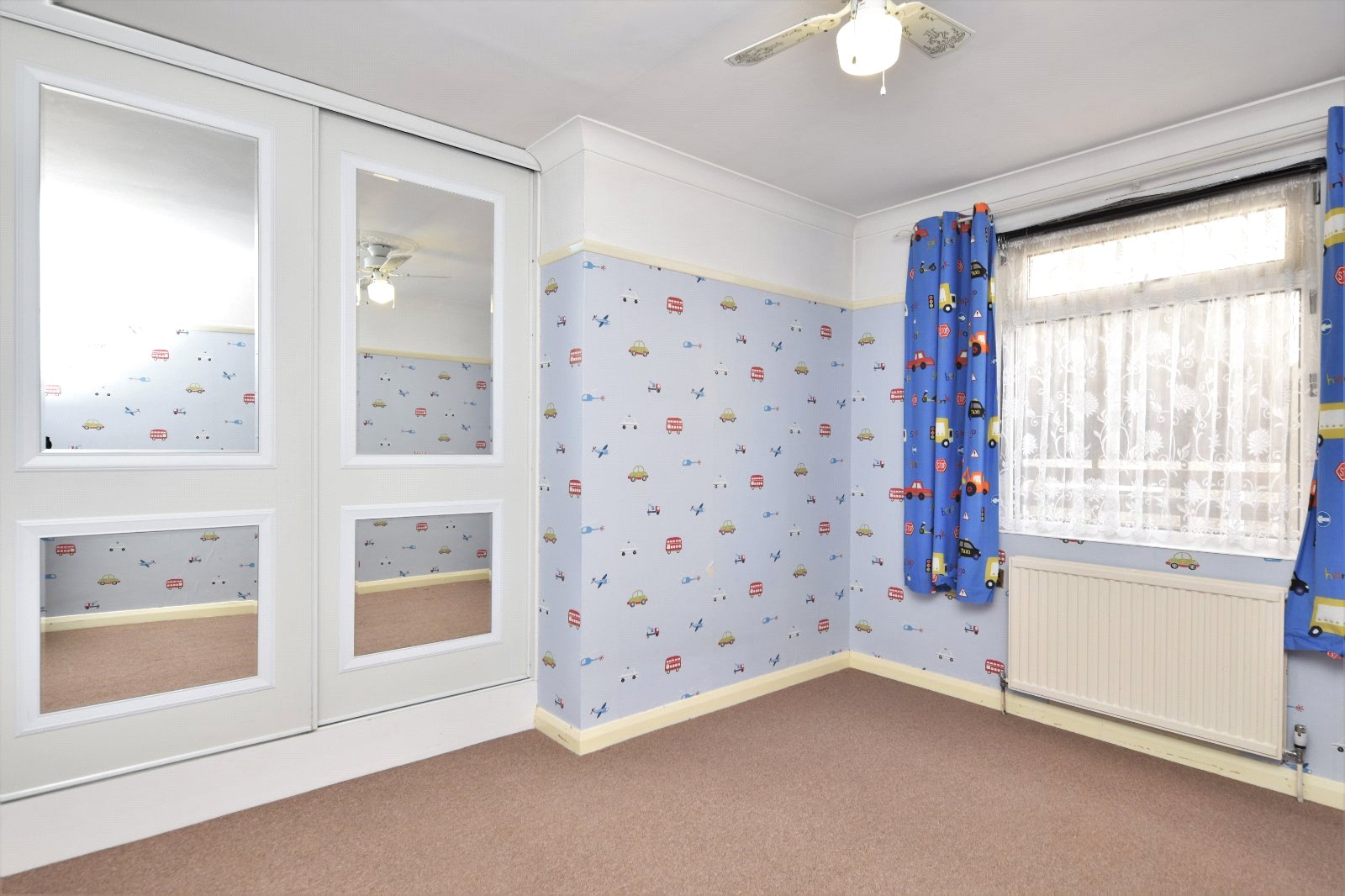 uPVC double glazed window to side front aspect. Built in 'slide'a'robe wardrobe to alcove. Radiator. Picture rail. Cornice to smooth plastered ceiling inset with moulding and ceiling mounted fan.