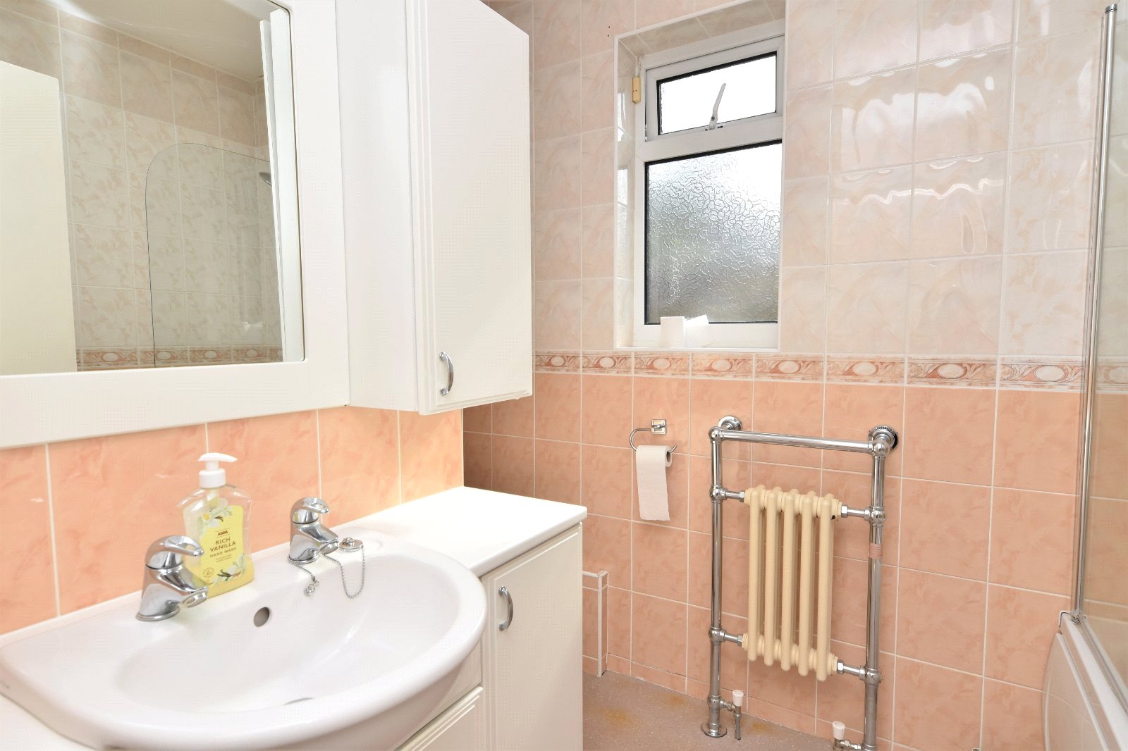 Obscure uPVC double glazed window to side aspect. Tiling to all visible walls. The three piece suite comprises panelled enclosed bath with mixer tap and shower attachment with fitted shower screen, vanity wash hand basin with storage cupboards under and dual flush wc. Traditional style column radiator with heated towel rail surround. Wall mounted extractor fan. Smooth plastered ceiling.