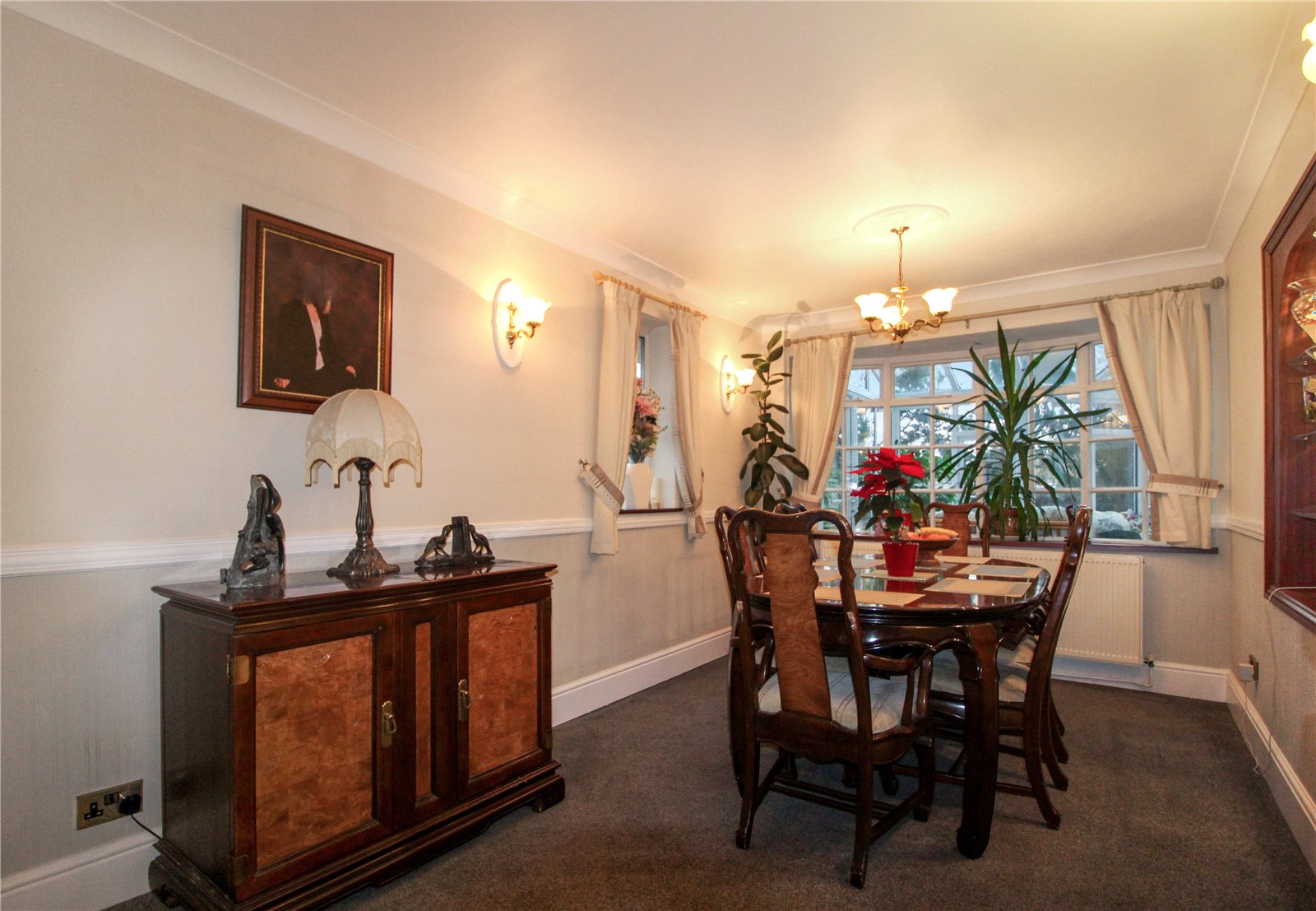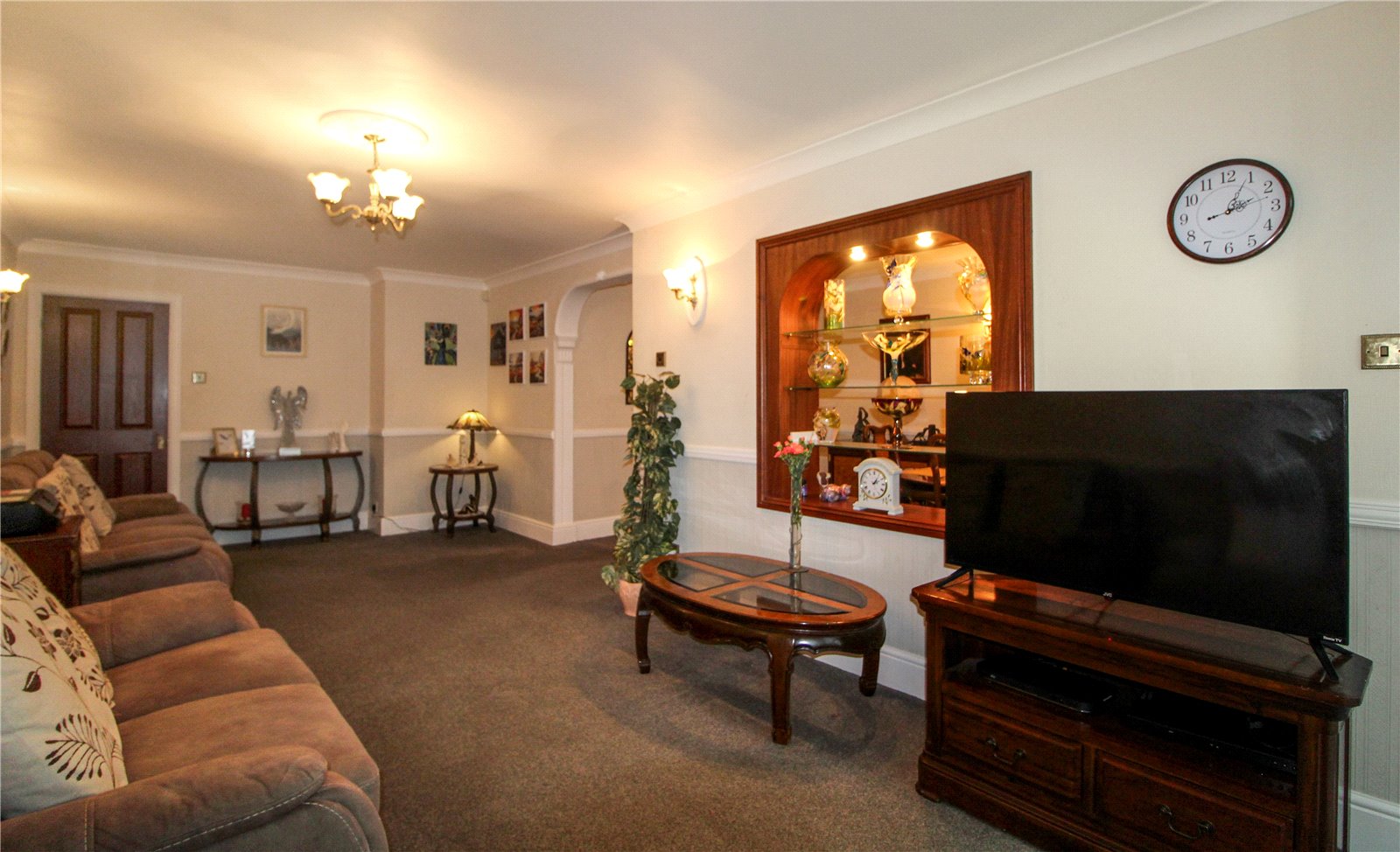 uPVC double glazed patio doors to rear into Conservatory and feature archway into Dining Room. Carpet to floor. Skirting. Wallpaper to half height. Two radiators. Three wall light points. Coving to smooth plastered ceiling with decorative centre ceiling rose and ceiling light.