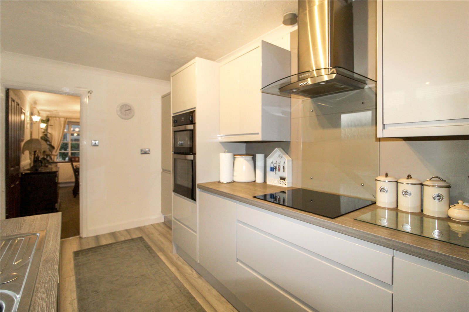 uPVC door with double glazed window to side with uPVC double glazed window adjacent. Fitted with a worksurface comprising inset stainless steel sink and drainer unit with chrome monobloc mixer tap, four ring electric Neff induction hob with glass splashback and extractor hood above, a comprehensive range of contemporary base units with acrylic splashback housing integrated dishwasher, washing machine and tumble dryer with matching eye-level cabinets with recessed spotlights housing combi boiler, an eye-level Belling oven with grill under and full-length integrated fridge with matching storage cupboard adjacent. Wood-effect laminate flooring. Panelling to half height. Chrome light switches. Coving to ceiling with ceiling light.