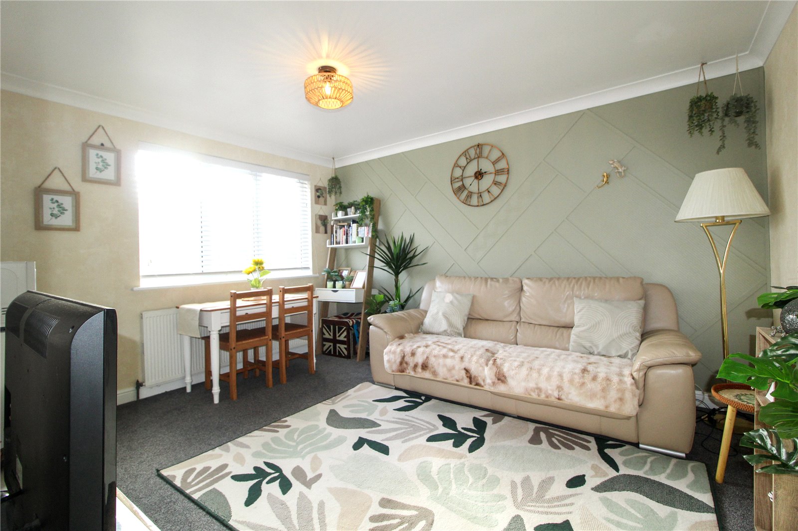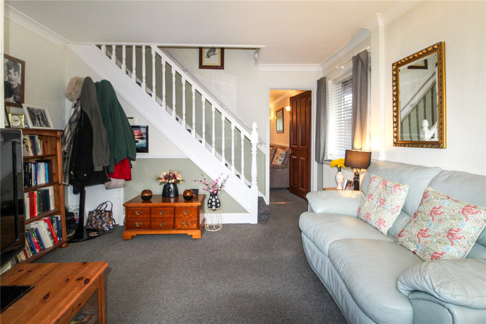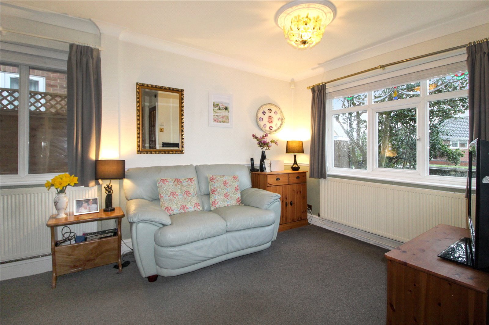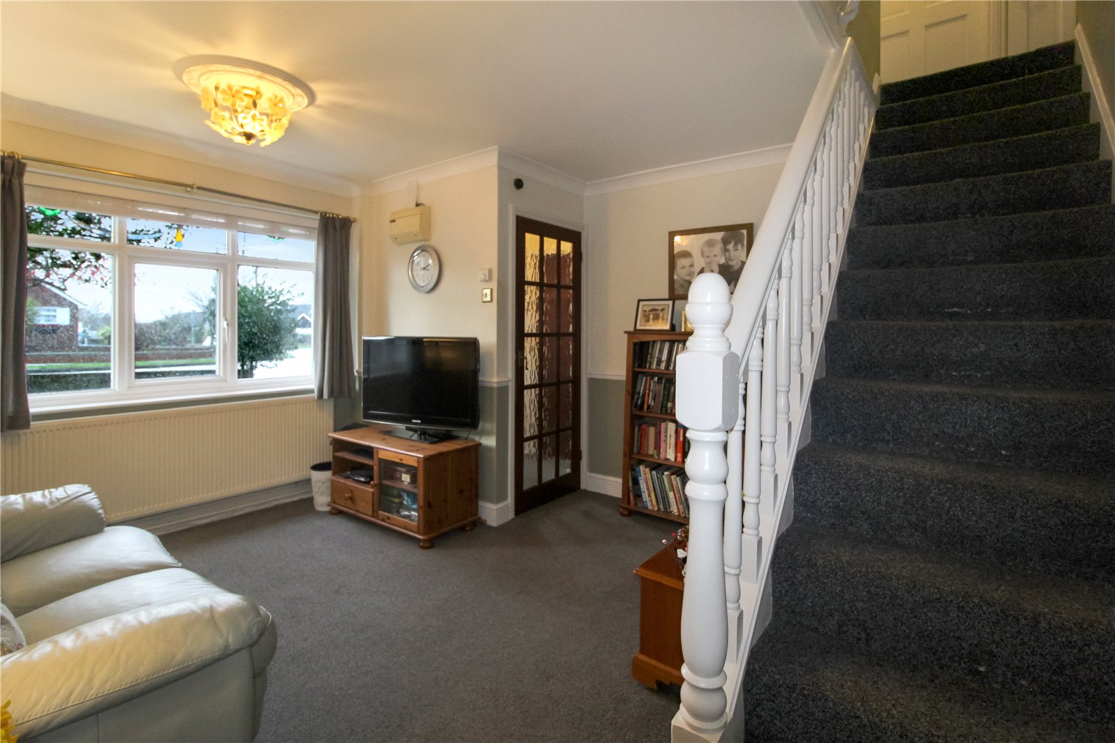 Dual aspect room with uPVC double glazed window to front with feature, stained glass inserts above and uPVC double glazed window to side. Carpet to floor. Skirting. Two radiators. Thermostat control. Alarm controls. Electric consumer unit. Ornate centre ceiling rose with ceiling light. Carpet to stairs leading to first floor landing. Panelled doors to Living Room and understairs storage cupboard.