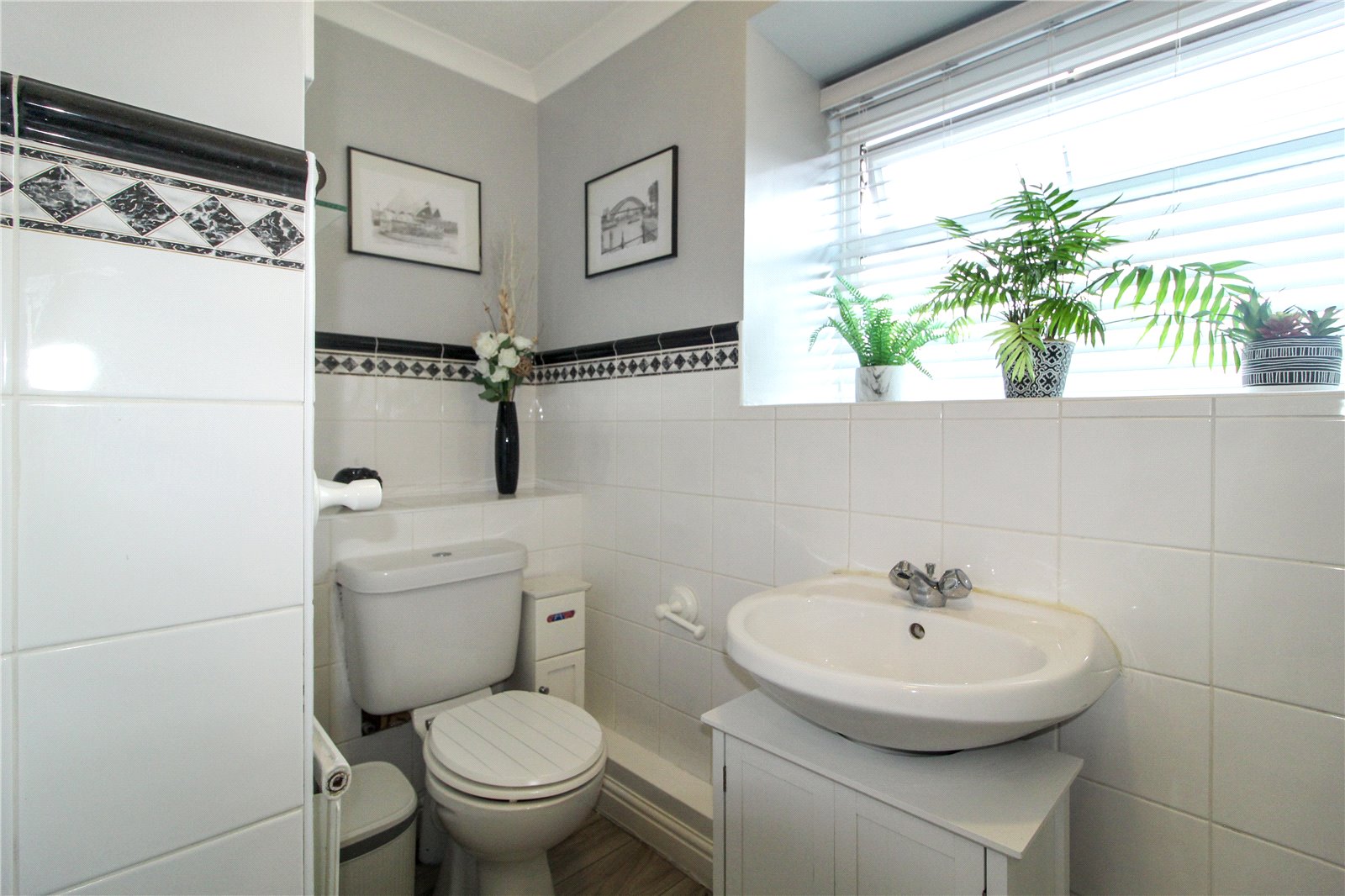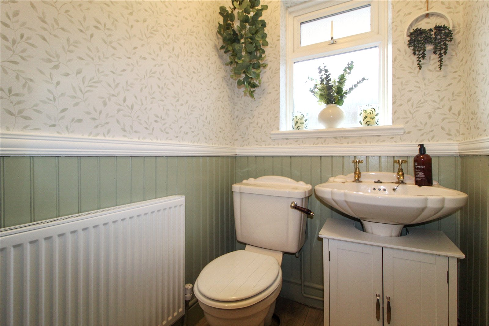 uPVC double glazed obscure window to side. Fitted with a two-piece suite comprising wash basin with bronze taps and low-level w.c.. Wood-effect laminate flooring. Radiator. Panelling to half height. Wallpaper to the remainder with coving to ceiling and ceiling light.