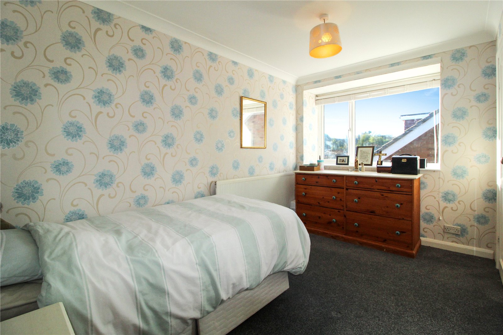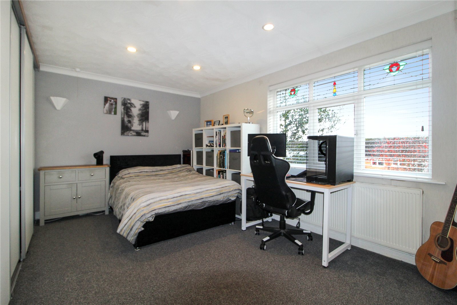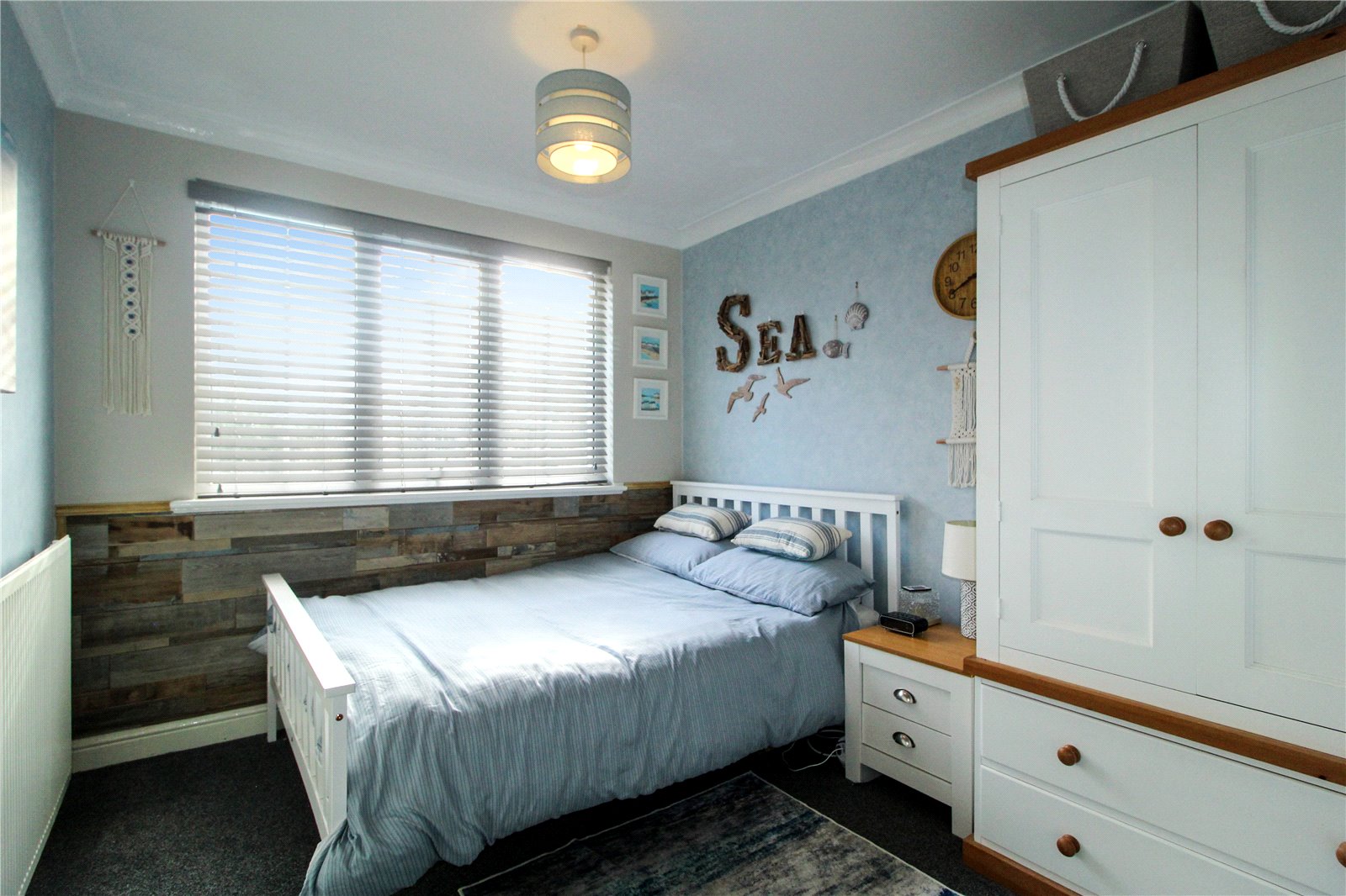 uPVC double glazed window to rear. Carpet to floor. Skirting. Radiator. Feature wall to rear with scaffold boards to half height and smooth plastered wall above with wallpapered walls to the remainder. Coving to smooth plastered ceiling and ceiling light.
