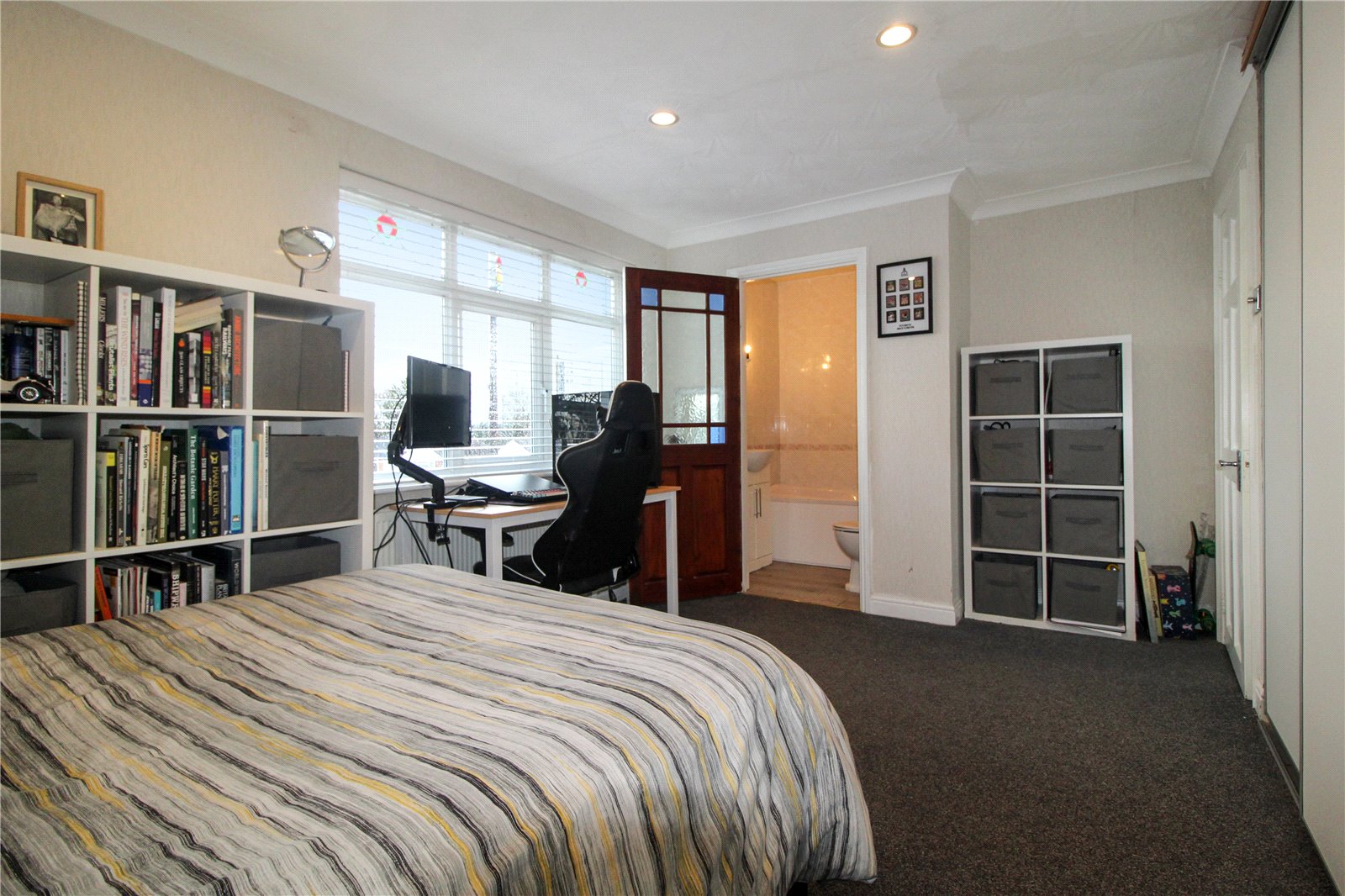 uPVC double glazed window to front with lead light glazed inserts above. Five sliding doors into fitted wardrobes. Carpet to floor. Skirting. Radiator. Coving to ceiling with recessed spotlights. Obscure glazed door into ensuite.