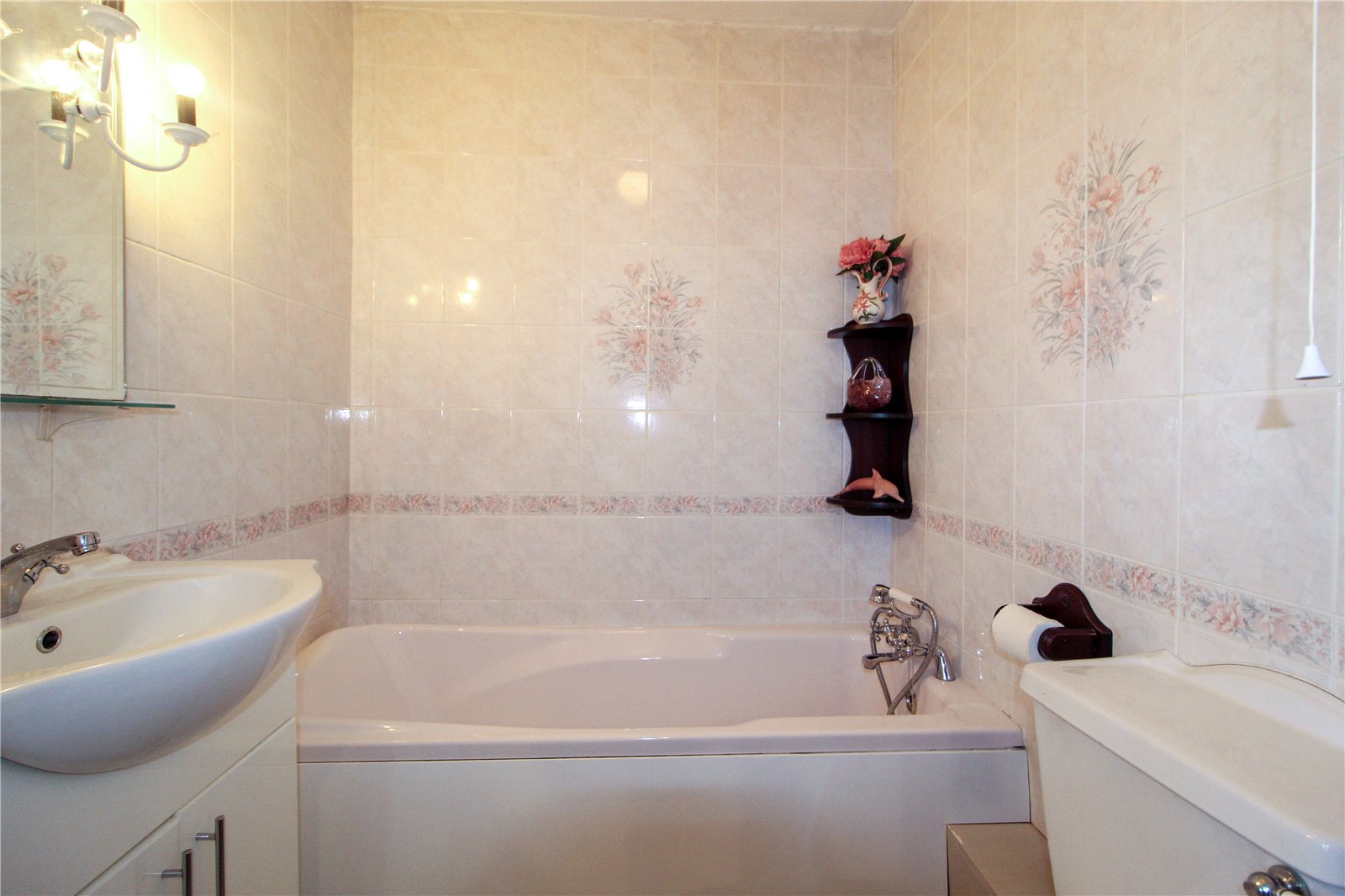 Fully tiled walls and fitted with a three-piece suite comprising panel enclosed bath with chrome mixer tap and handheld shower attachment, wash basin with chrome mixer tap set upon vanity unit with cupboards under, vanity light and mirror above and low-level w.c.. Wood-effect laminate flooring. Ceiling light. Extractor fan.