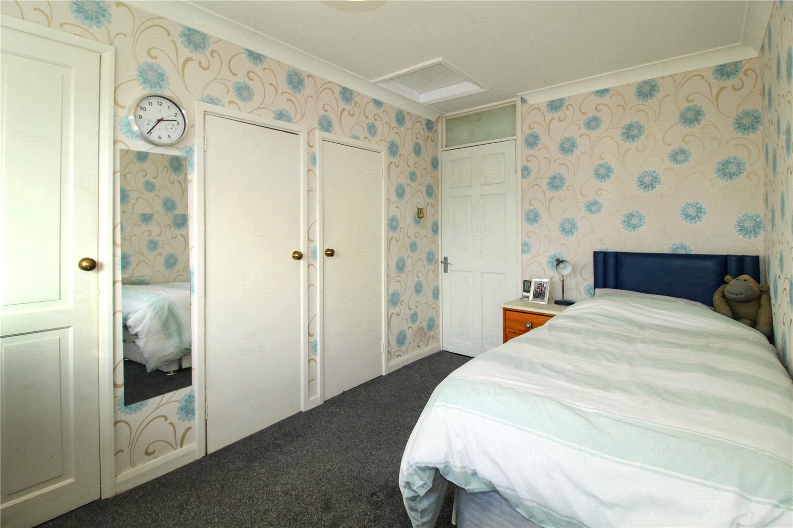 uPVC double glazed window to side. Carpet to floor. Skirting. Radiator. Wallpapered walls. Two storage cupboards with shelving and a further over-the-stairs walk-in storage cupboard with ceiling light. Coving to smooth plastered ceiling. Ceiling light and access to loft space via loft hatch. NB: The walk-in storage cupboard is currently being used as a walk-in wardrobe but is spacious enough to be converted into a w.c./ shower.