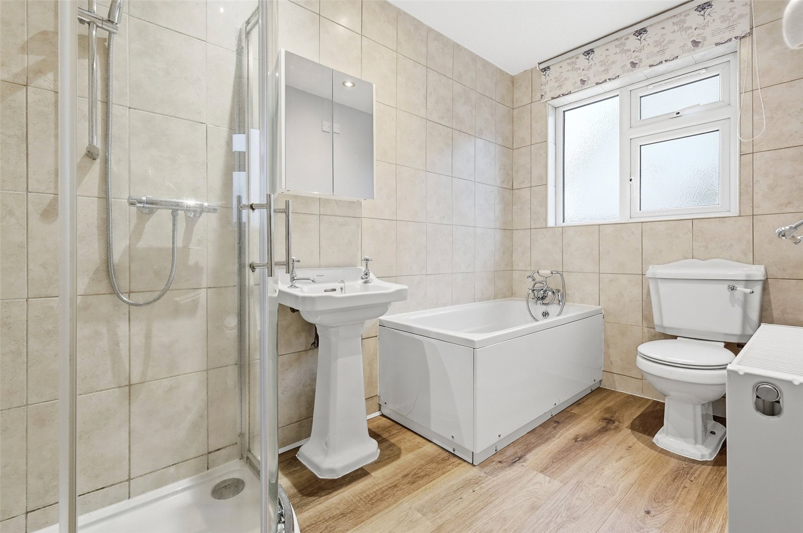 UPVC double obscured glazed window to side. Fitted with a modern four piece comprising low flush WC, pedestal wash basin, panelled bath with mixer tap and detachable showerhead and enclosed shower cubicle with wall mixer, adjustable showerhead and glass shower screen. Wall mounted radiator. Wood effect vinyl flooring. Part tiled walls. Smooth plastered ceiling with recessed LED lighting. Ceiling mounted extractor fan.