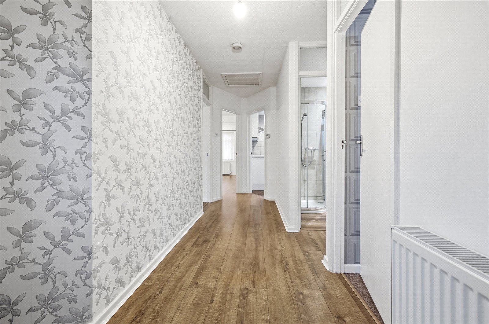 Approached via UPVC front door with inset obscured leaded light panels. UPVC double glazed window to side. Doors lead off to all rooms. Access to loft space. Wall mounted radiator. Storage cupboard to side housing utilities. Wood effect laminate flooring.