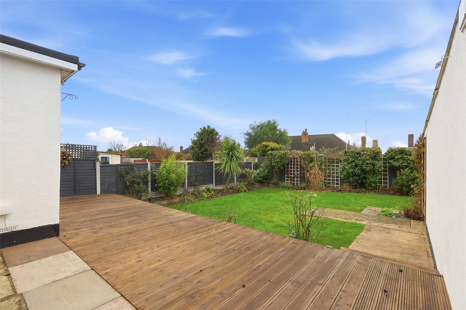 The property benefits from a good size South backing garden to rear with large raised decking area spanning the width of the property. Remainder of garden is laid mostly to lawn with mature planted borders offering a variety of trees and shrubs. Access to side. Access to garage.