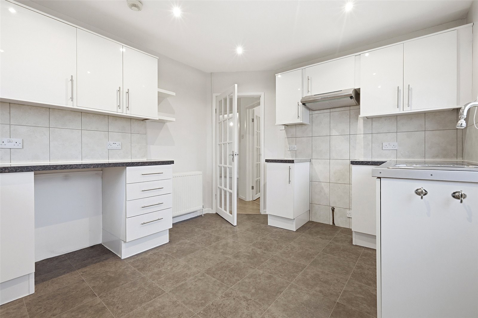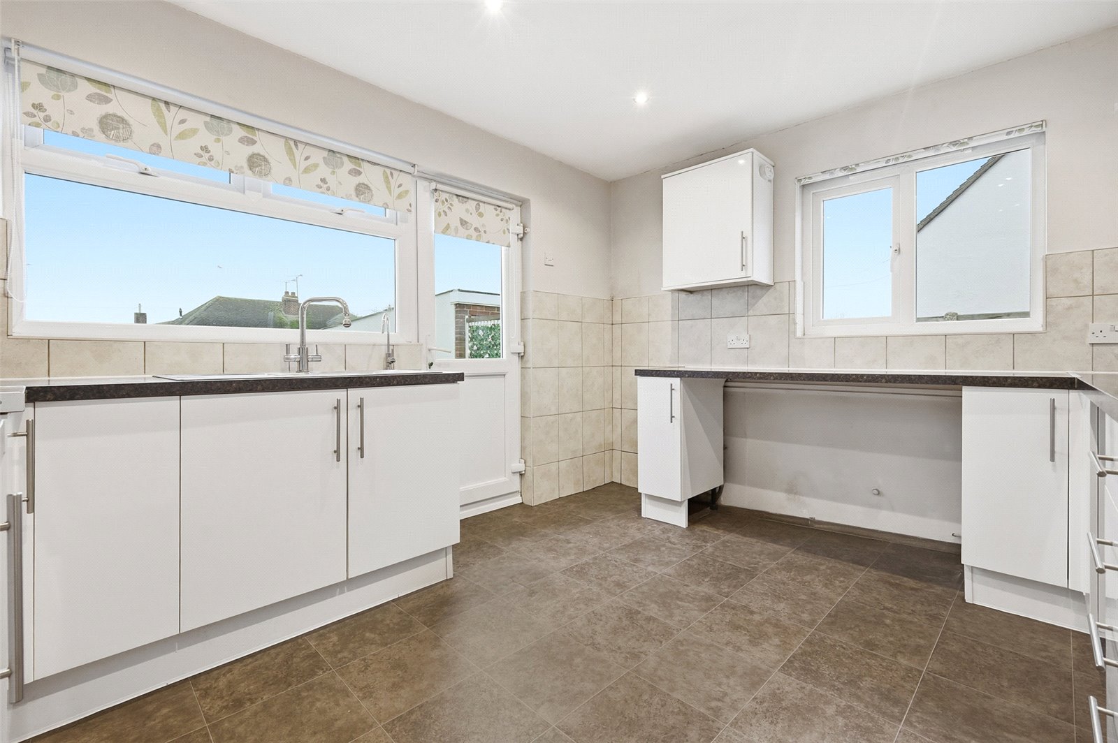 UPVC door to rear with inset double glazed panel. Double glazed window to rear and to side. Kitchen is fitted with a modern range of base and eye level high gloss cabinets incorporating a squared edge working surface. Inset one and half bowl stainless steel sink with mixer tap and drainer unit. Space for free standing oven with fitted extractor hood above. Space for free standing fridge freezer. Space and plumbing for washing machine and dishwasher. Space for further undercounter fridge/freezer. Wall mounted Ideal combination gas fired boiler. Tiled splashback. Tiled effect vinyl flooring. Wall mounted radiator. Smooth plastered ceiling with recessed LED lighting.