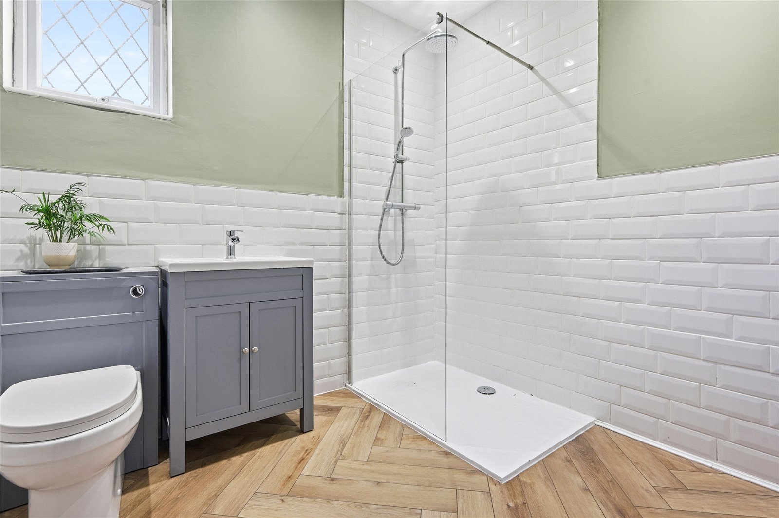 Opaque upvc double glazed window to the side aspect. Fitted with a modern white three piece suite comprising of low level w.c with concealed sistern, walk-in shower cubicle with twin headed shower, vanity wash hand basin with cupboard under and stainless steel mixer tap. Part tiling to walls. Smooth plastered ceiling with inset spot lighting. Extractor fan. Chrome heated towel rail. Luxury vinyl tiled ' herringbone ' wood effect flooring. Loft access hatch. ( Loft is insulated and has light connected. )