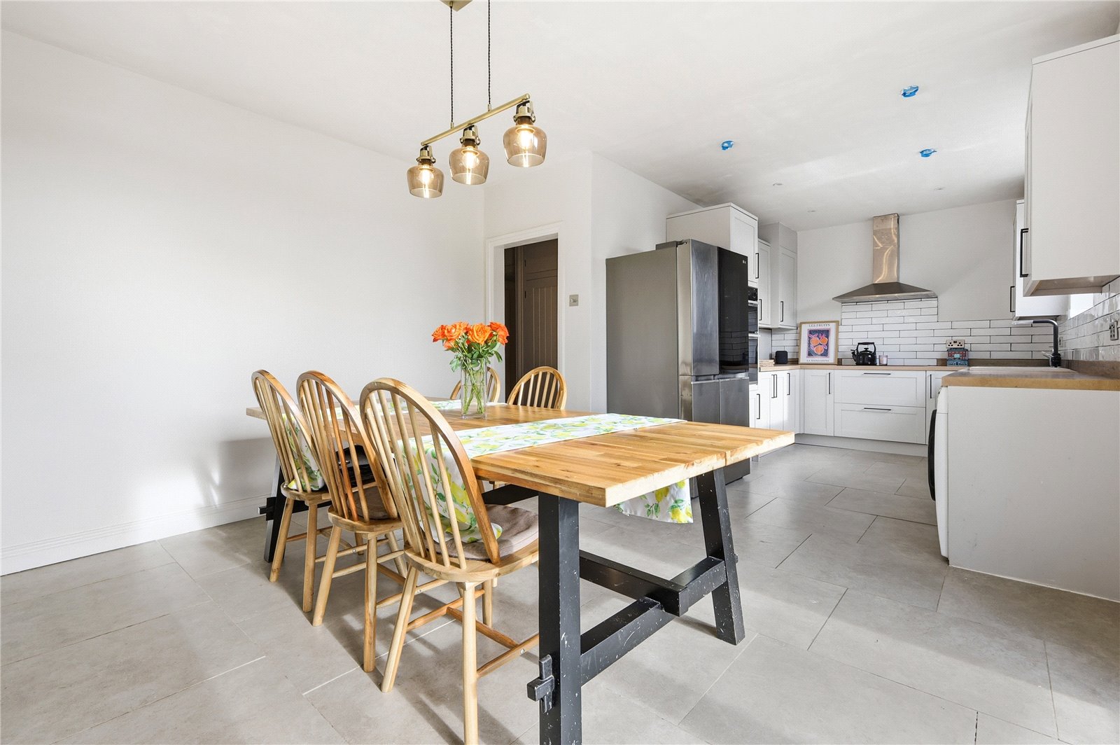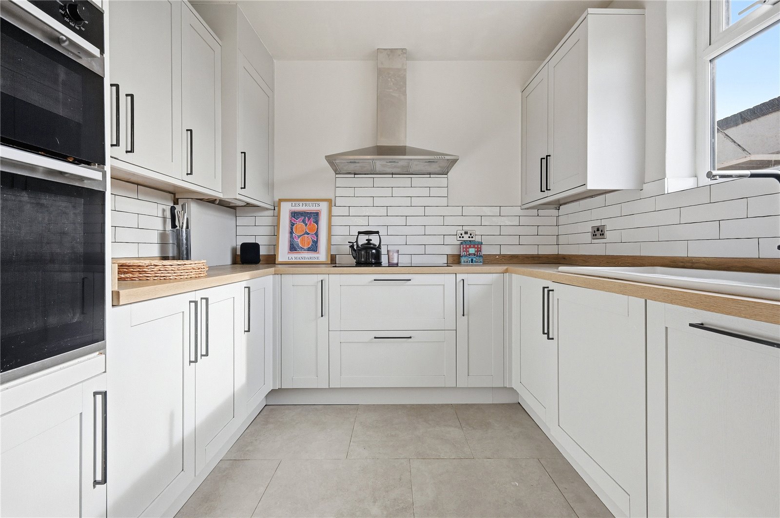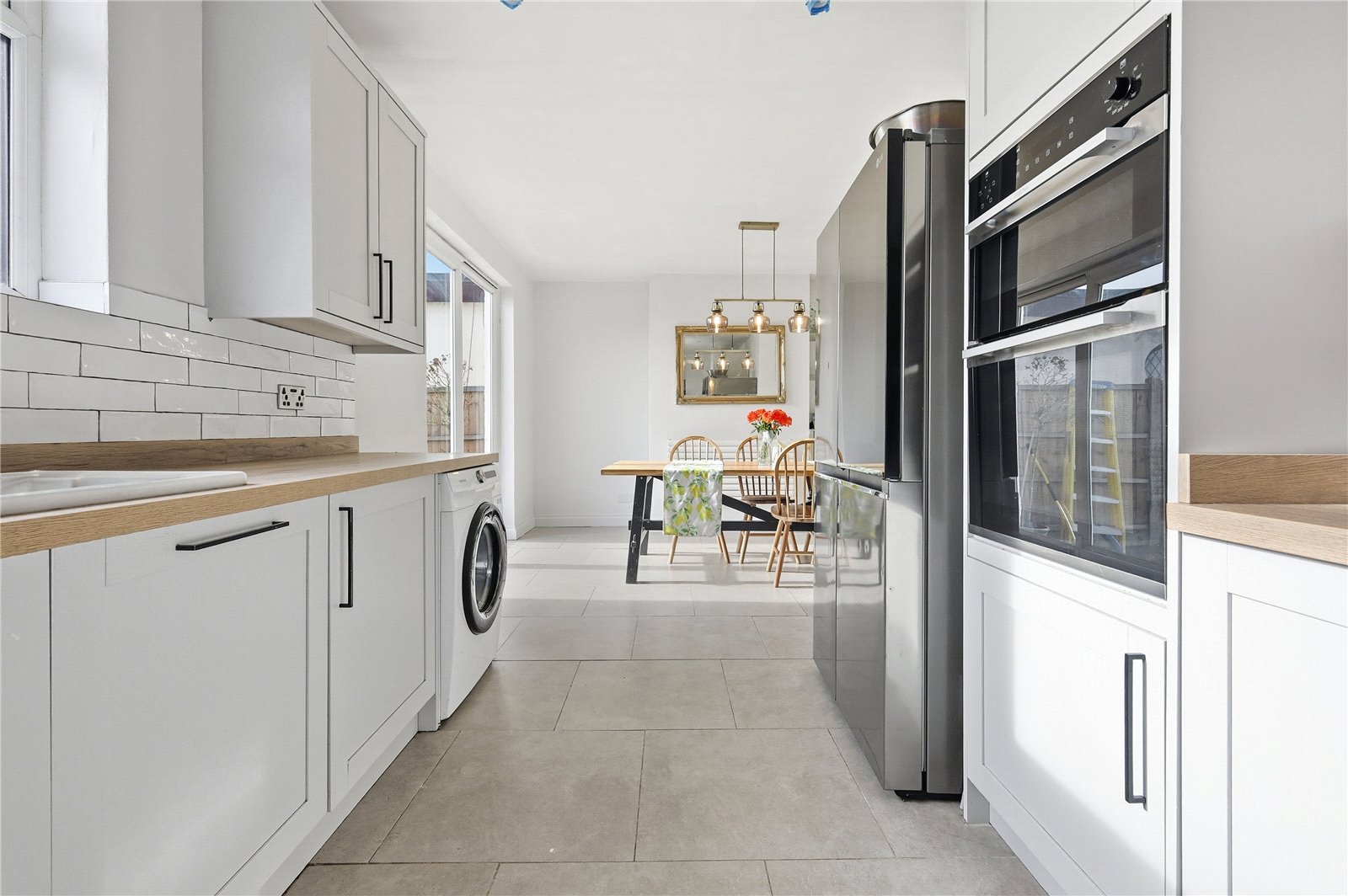 Upvc double glazed window to the rear aspect with tilt and turn patio doors adjacent giving access to the rear garden. The kitchen has been recently fitted with a range of modern base units with roll edge work surfaces incorporating a ceramic single drainer sink unit with mixer tap. Further matching wall mounted storage units housing central heating boiler. Integrated double oven and four ring induction hob with extractor fan over. Integrated dishwasher. Space and plumbing for washing machine. Space for ' American style ' fridge/freezer. Part tiling to walls with upstand. Smooth plastered walls and ceiling with inset spot lighting. Porcelain tiled floor. Contemporary radiator. Fitted base cupboards and shelving to chimney stack recess.