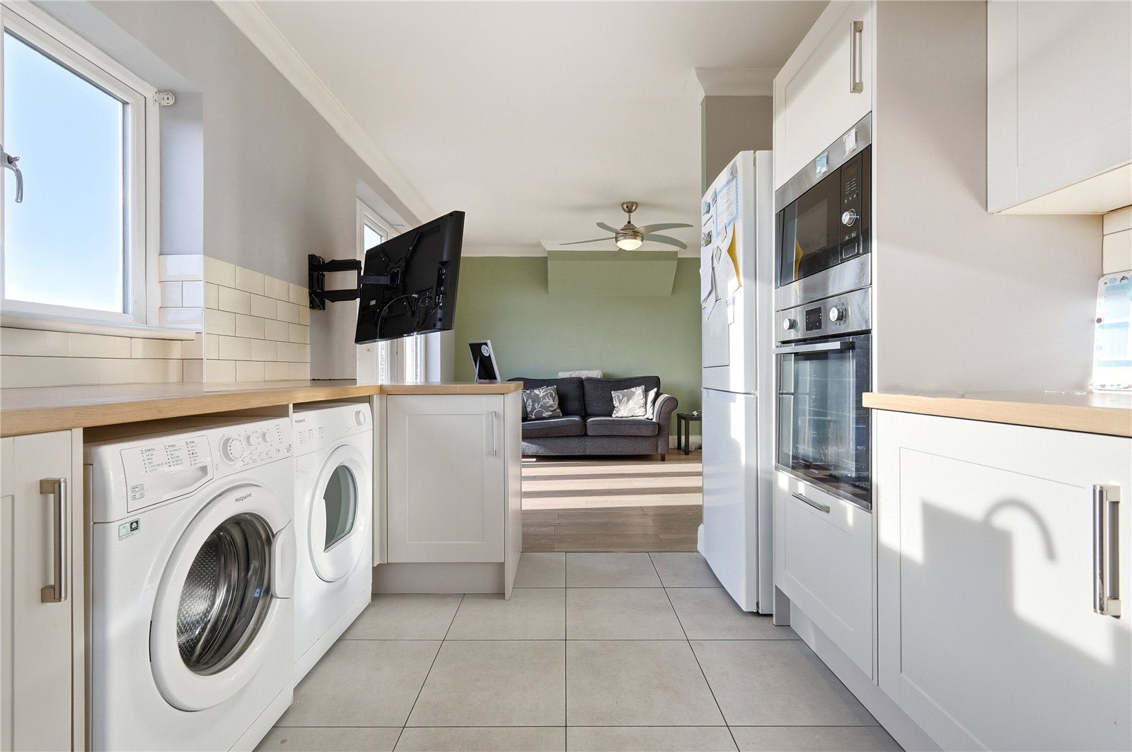 Overall size. UPVC double glazed French doors to rear with full height windows adjacent providing access to the sunny South backing rear garden. UPVC double glazed window to rear and to side. Kitchen is fitted with a modern range of base and eye level Shaker style cabinets incorporating a rolled edge working surface with inset four burner ceramic hob with canopied extractor hood above. Inset Porcelain sink with mixer tap and drainer unit. Space and plumbing for washing machine and dishwasher. Space for tumble dryer. Space for free standing fridge/freezer. Integrated electric fan assist oven with matching integrated microwave oven above. Tiled splashback. Separate cupboard housing Ideal combination gas fired boiler. Tiled flooring to kitchen area. Wood effect laminate flooring to lounge. Wall mounted radiator. High level skirting. Coved cornice to smooth plastered ceiling.