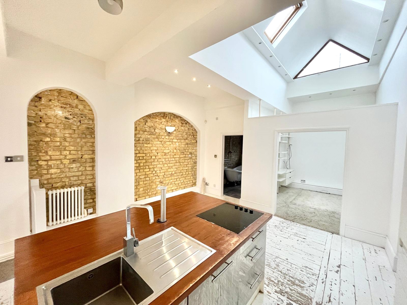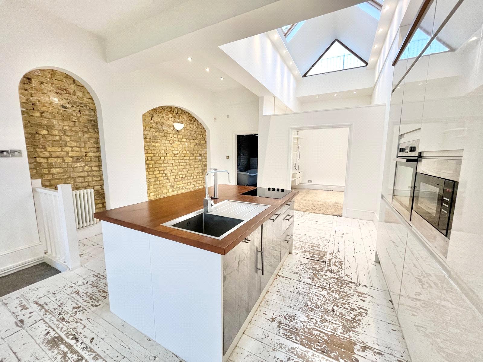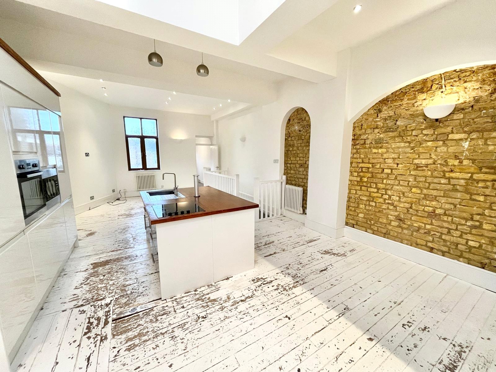 overall size. UPVC double obscured glazed window to front. Large double height vaulted ceiling with two double glazed velux windows. Double obscured glazed feature window to rear. Kitchen is fitted with a modern and contemporary range of high gloss cabinets incorporating large central island unit with stainless steel fronted cabinets, squared edge wooden work top, inset four burner ceramic hob. Inset stainless steel with mixer tap and drainer unit. Integrated electric fan assisted oven. Integrated microwave. Under counter dishwasher. Integrated washing machine and fridge/freezer. Three wall mounted designer radiators. Two feature exposed brick walls. Exposed wooden floorboards. High level skirting. Smooth plastered ceiling with recessed LED lighting. Accent lighting to vaulted area.