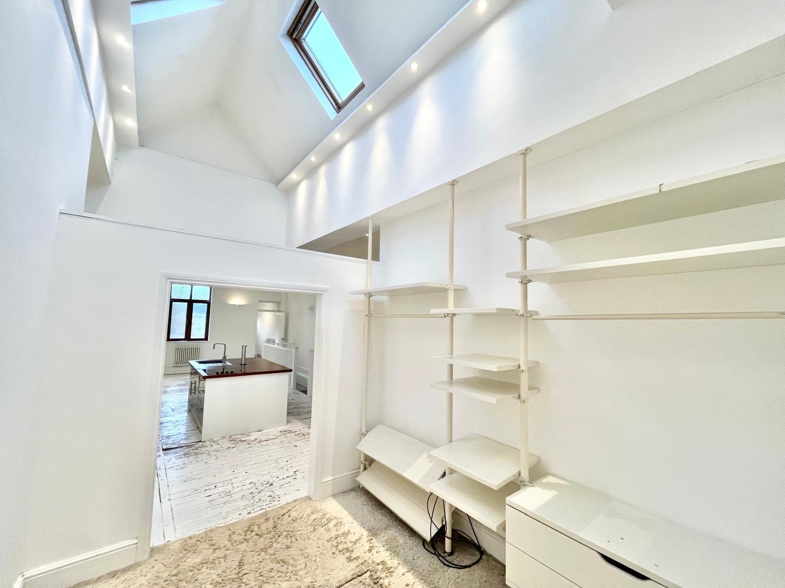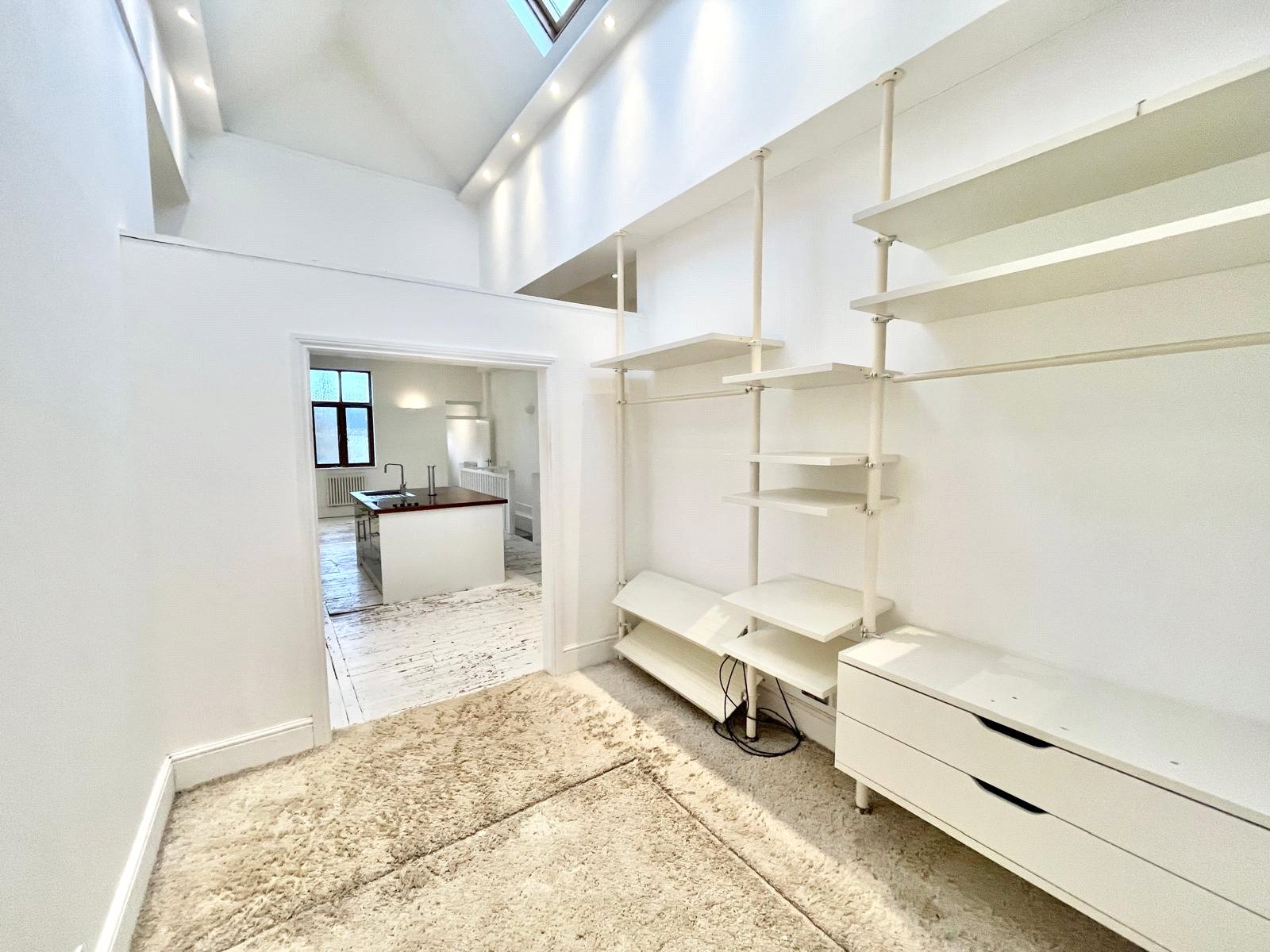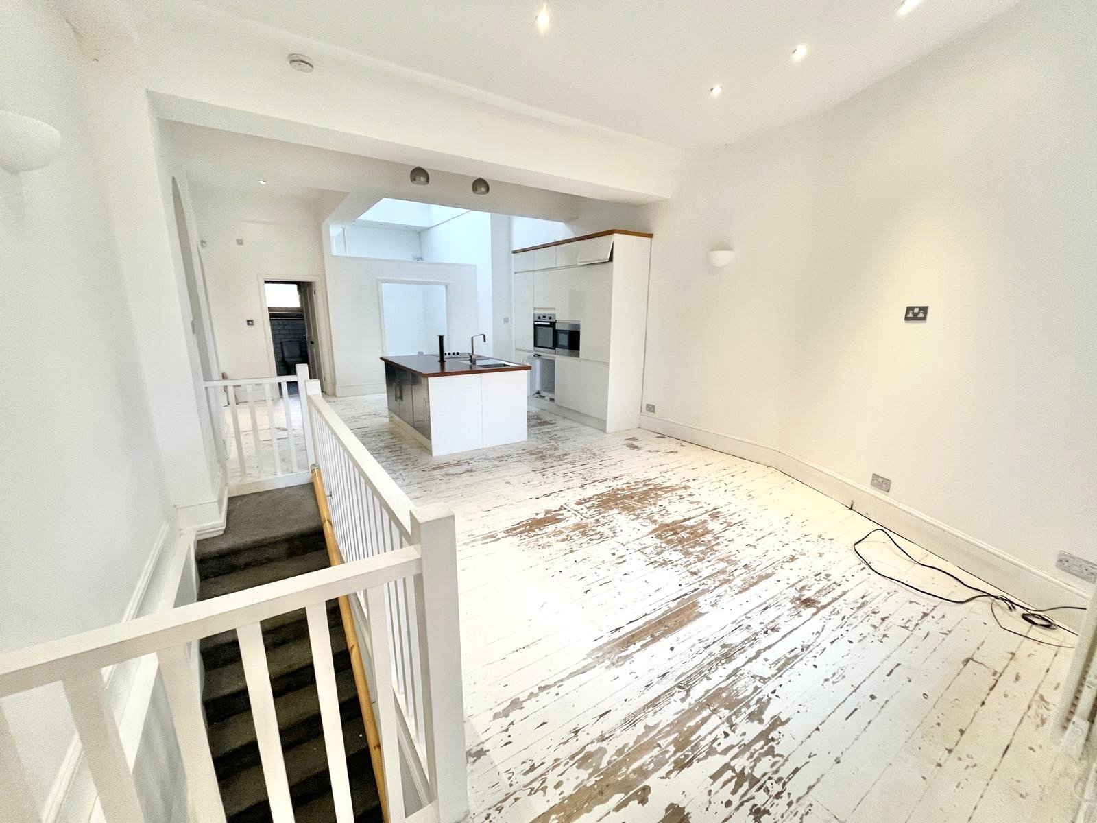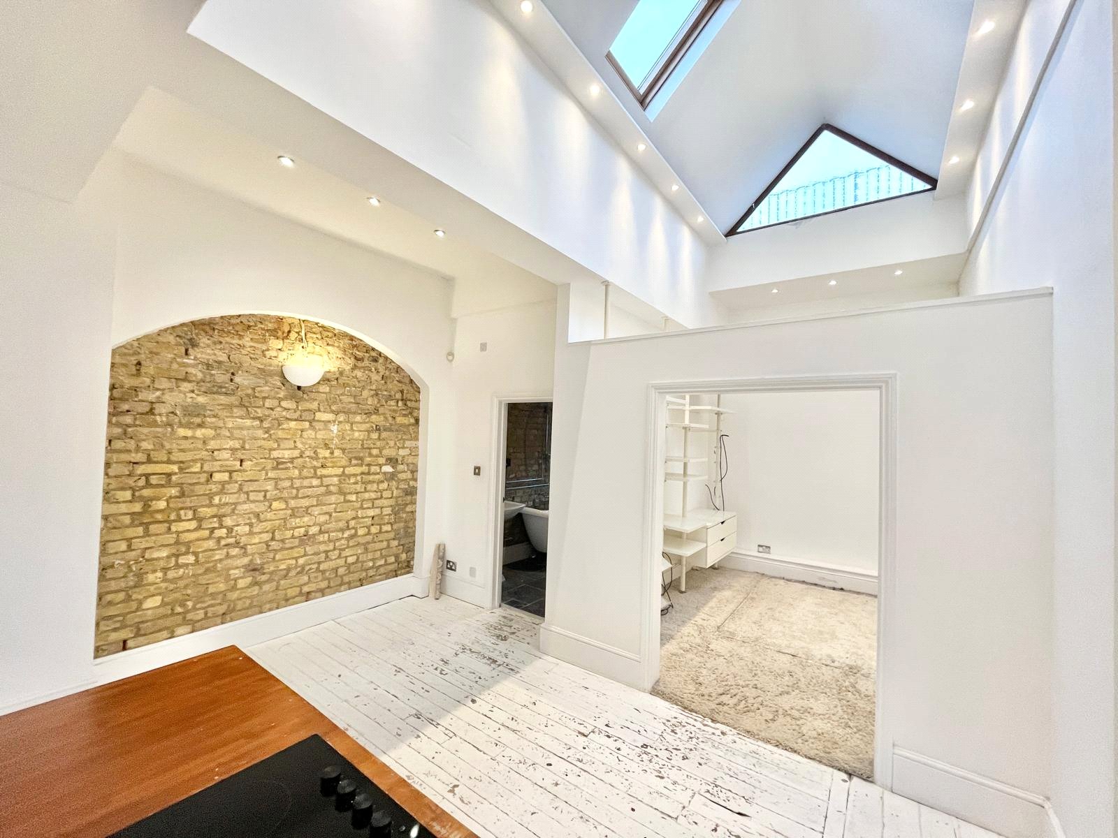 overall size. UPVC double obscured glazed window to front. Large double height vaulted ceiling with two double glazed velux windows. Double obscured glazed feature window to rear. Kitchen is fitted with a modern and contemporary range of high gloss cabinets incorporating large central island unit with stainless steel fronted cabinets, squared edge wooden work top, inset four burner ceramic hob. Inset stainless steel with mixer tap and drainer unit. Integrated electric fan assisted oven. Integrated microwave. Under counter dishwasher. Integrated washing machine and fridge/freezer. Three wall mounted designer radiators. Two feature exposed brick walls. Exposed wooden floorboards. High level skirting. Smooth plastered ceiling with recessed LED lighting. Accent lighting to vaulted area.