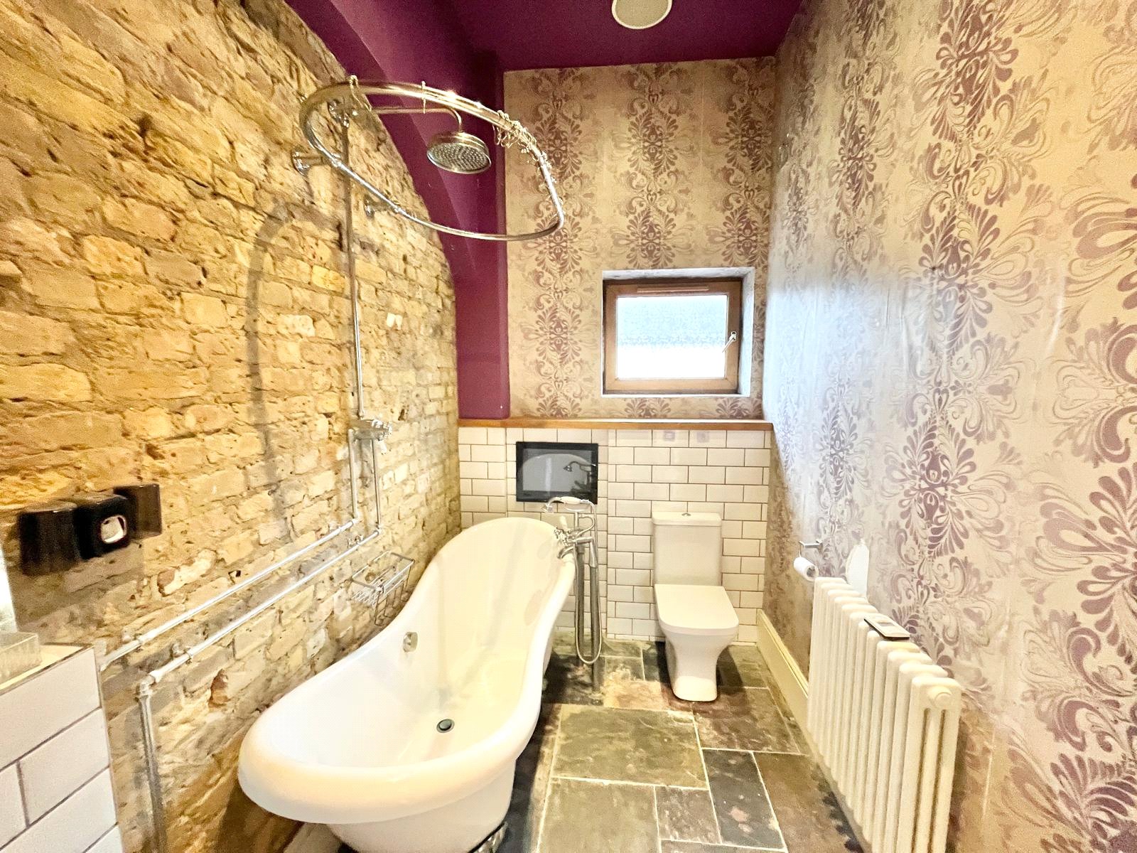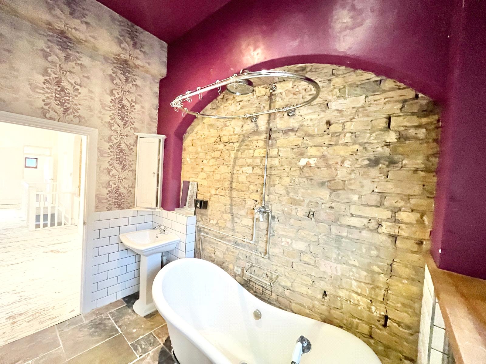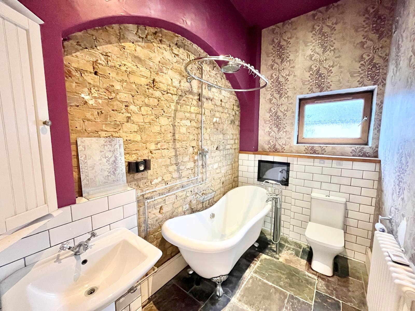 UPVC double glazed tilt and turn window to rear. Fitted with a three piece suite comprising low flush WC, pedestal wash basin with mixer tap and free standing rolled top bath with mixer tap plus detachable showerhead. Separate wall mounted mixer with rainfall showerhead. Wall mounted designer radiator. Tiled flooring. Part tiled walls. Feature exposed brickwork wall. Recessed wall mounted television. Smooth plastered ceiling with recessed LED lighting.