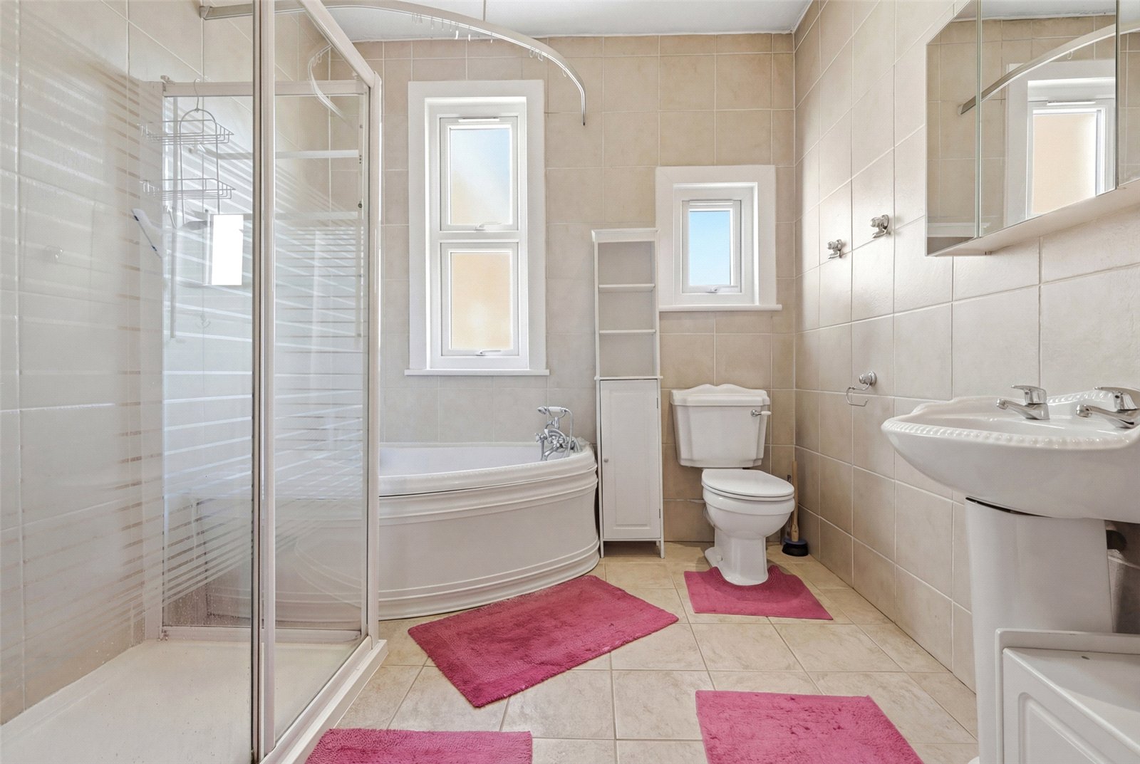Two UPVC double obscured glazed windows to rear. Fitted with a four piece suite comprising low flush WC, pedestal wash basin, corner bath with mixer tap plus wall mounted showerhead and larger than average enclosed shower with wall mounted mixer, adjustable showerhead and glass show screen. Chrome heated towel rail. Tiled floors. Fully tiled walls. Recessed LED lighting. Storage cupboard to side housing Ideal combination gas fired boiler.
