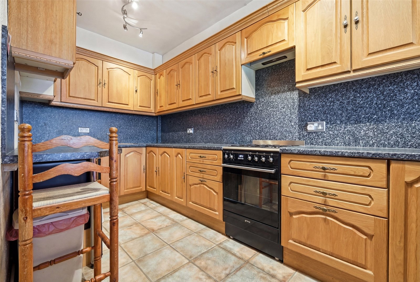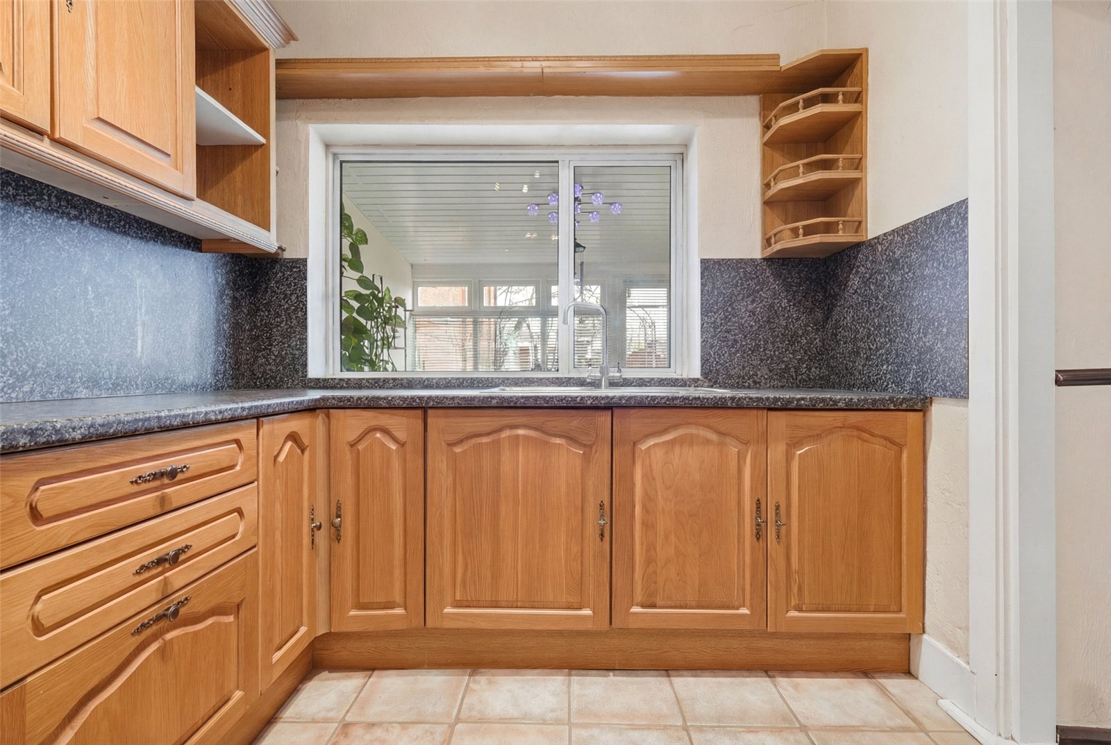 Double glazed window to rear. Serving hatch to side. Kitchen is fitted with a range of Shaker style wooden fronted cabinets incorporating a rolled edge working surface with inset one and half bowl stainless steel sink with mixer tap and drainer unit. Space for free standing as cooked, existing to remain. Recessed extractor hood above. Space for under cabinet fridge and freezer. Panelled splashbacks. Tiled effect vinyl flooring. Chrome heated towel rail. Smooth plastered ceiling.