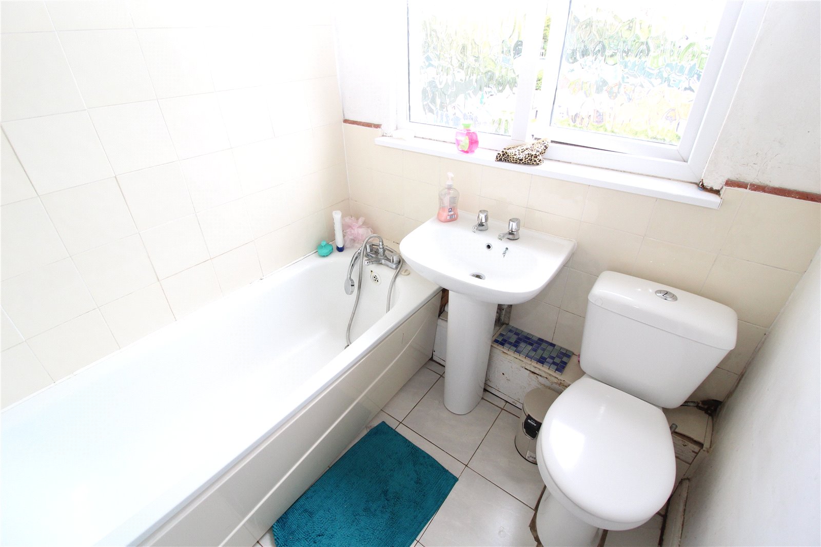 Opaque upvc double glazed window to the rear aspect. Fitted with a white three piece suite comprising of low level w.c, panelled enclosed bath with mixer tap and shower attachment and pedastal wash hand basin. Part tiling to walls.