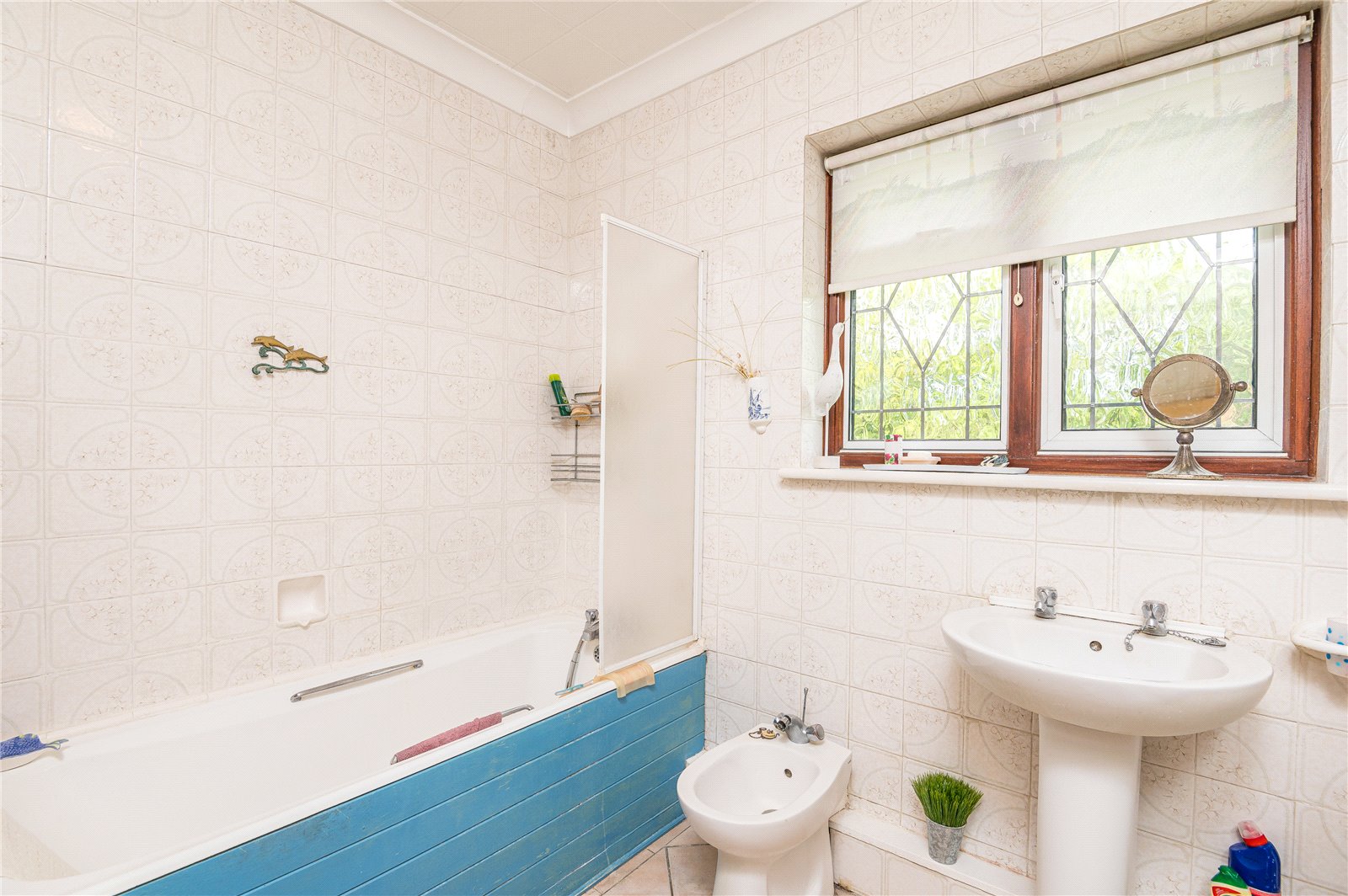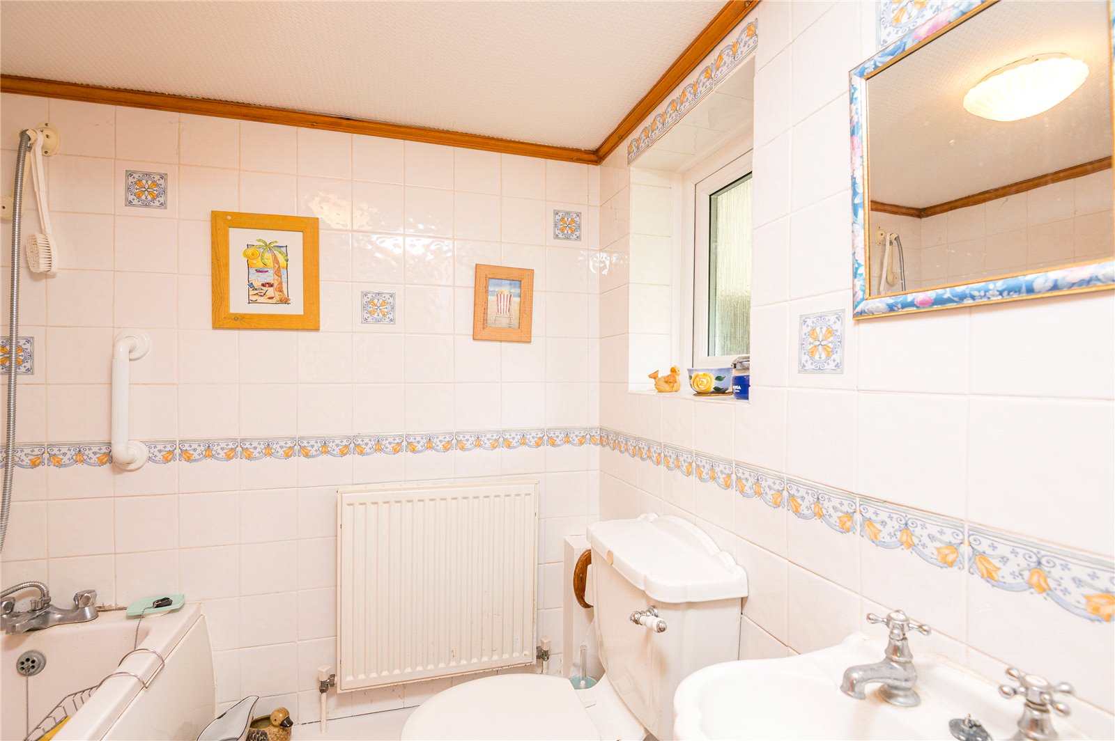 A lower ground floor bathroom, ideal to service the garden or the lower level annex accommodation. Obscure Upvc double glazed window to side. Quarry tiled floor. Fitted with a three piece suite comprising miniature bath with mixer tap and shower attachment, regency style close coupled WC, and regency style pedestal wash hand basin. Full tiling to walls with inset border and picture tiles. Radiator. Coved cornice to ceiling.