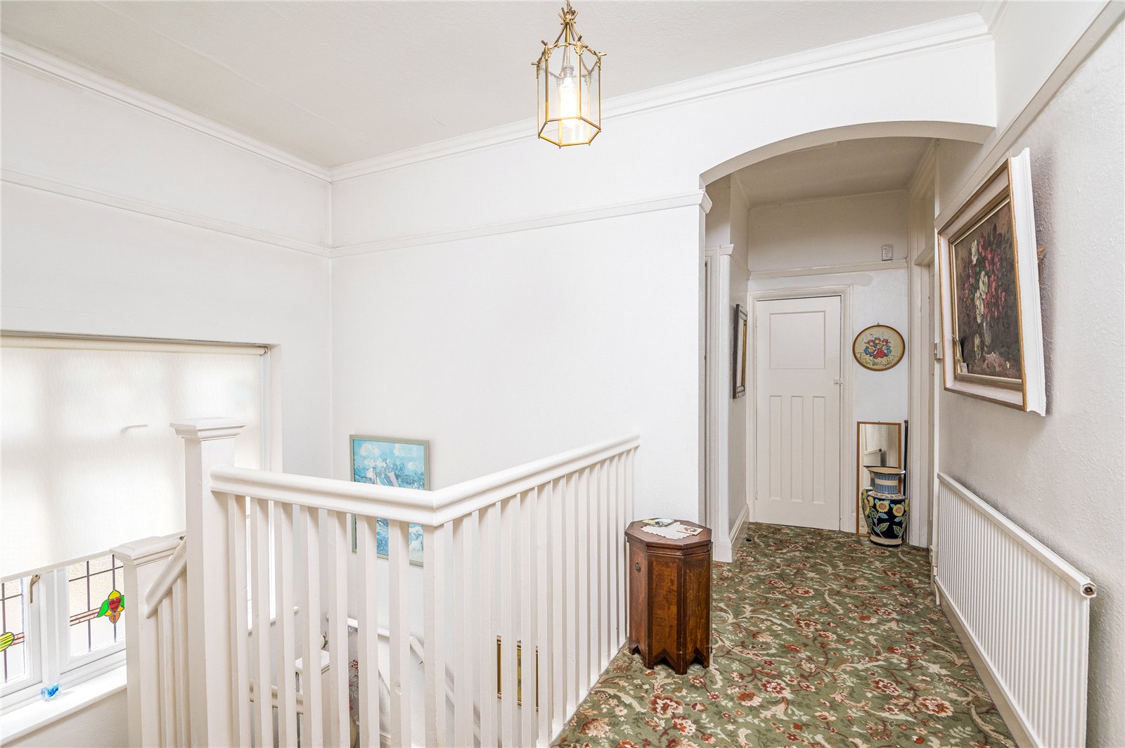 A generously proportioned landing with Upvc double glazed feature coloured leadlight window to side. Radiator. High level skirting. Picture rail. Coved cornice to ceiling. Access to boiler cupboard housing Ideal Mexico gas boiler serving domestic hot water and central heating system, with foam lagged copper cylinder and immersion control. Access to insulated roof space. Original panelled doors lead off to first floor rooms.