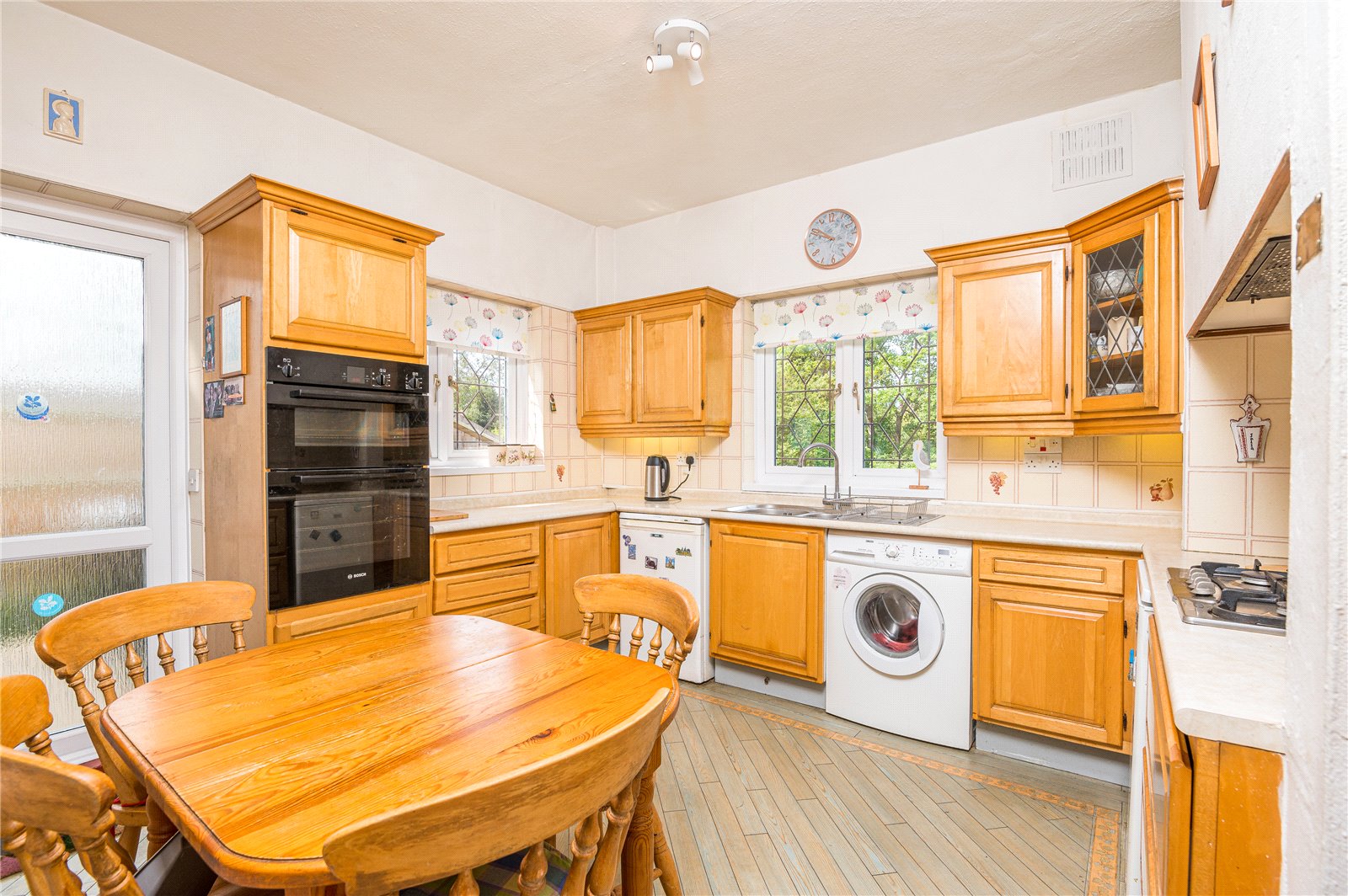 A dual aspect room with Upvc double-glazed leadlight windows to side and rear overlooking the landscaped rear garden, with views towards Priory Park beyond. Obscure Upvc double glazed door giving side access to the rear garden, the garage, and the front of the property. Radiator. Amtico bordered edge flooring. The kitchen is fitted with a comprehensive range of base and eye level cabinets in oak with leadlight glazed display cupboard. Space, plumbing and drainage for automatic washing machine and dishwasher, and further appliance space. The built in appliances include split level fan assisted electric oven by Bosch with four ring gas hob, and concealed extractor canopy above. Radiator. Space for refectory table. Tiling to picture rail height. Picture rail.