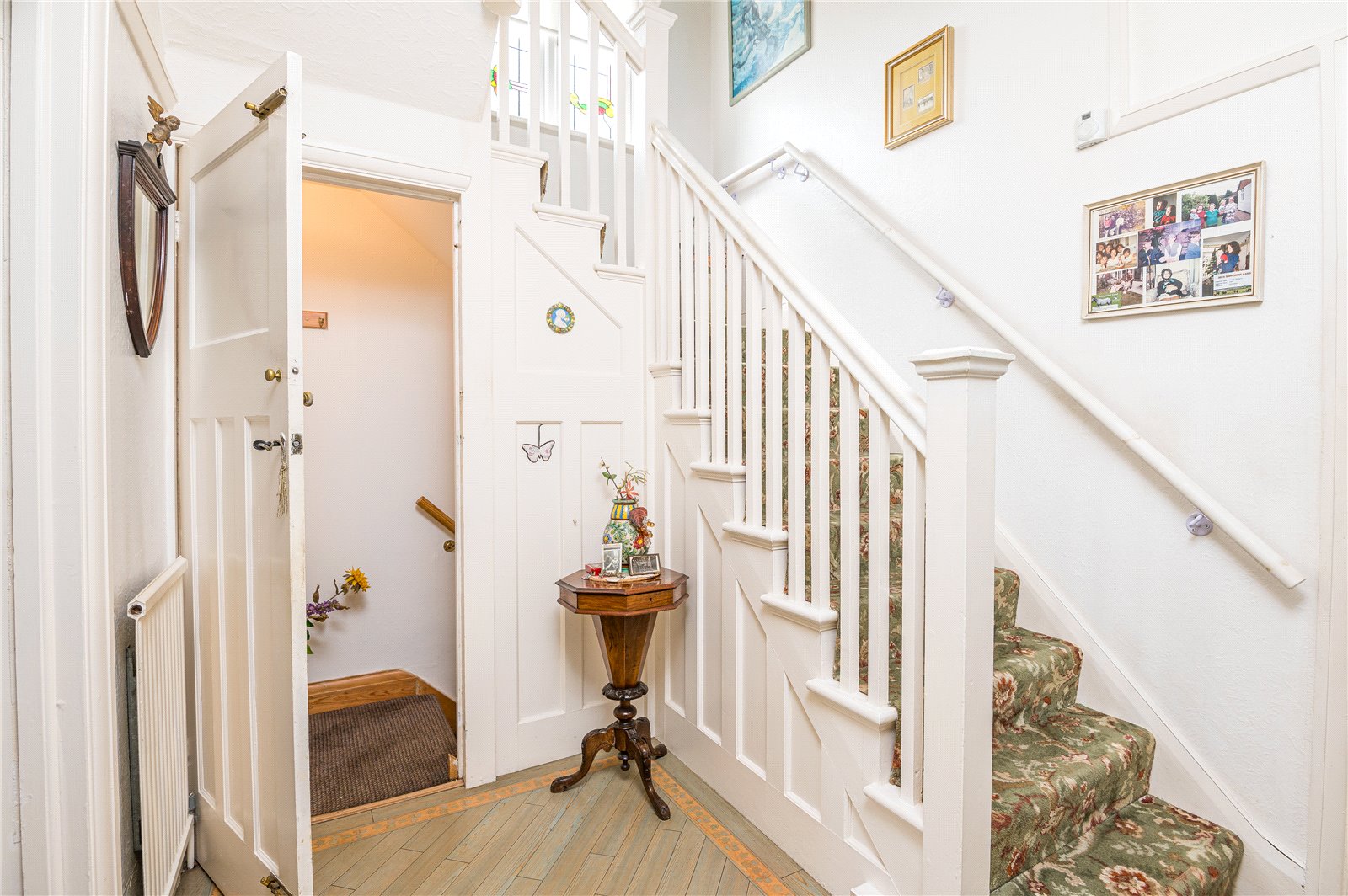 From the reception hallway, a panelled door gives access to a small landing area, with a turned staircase leading down to the lower ground floor accommodation, with obscure double glazed leadlight borrowed light from the family kitchen.
