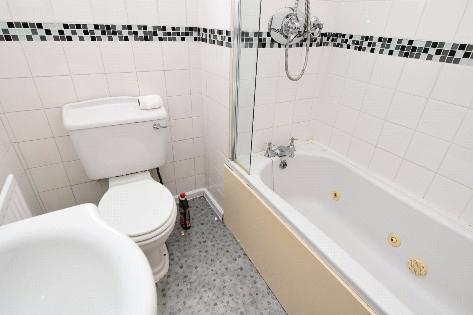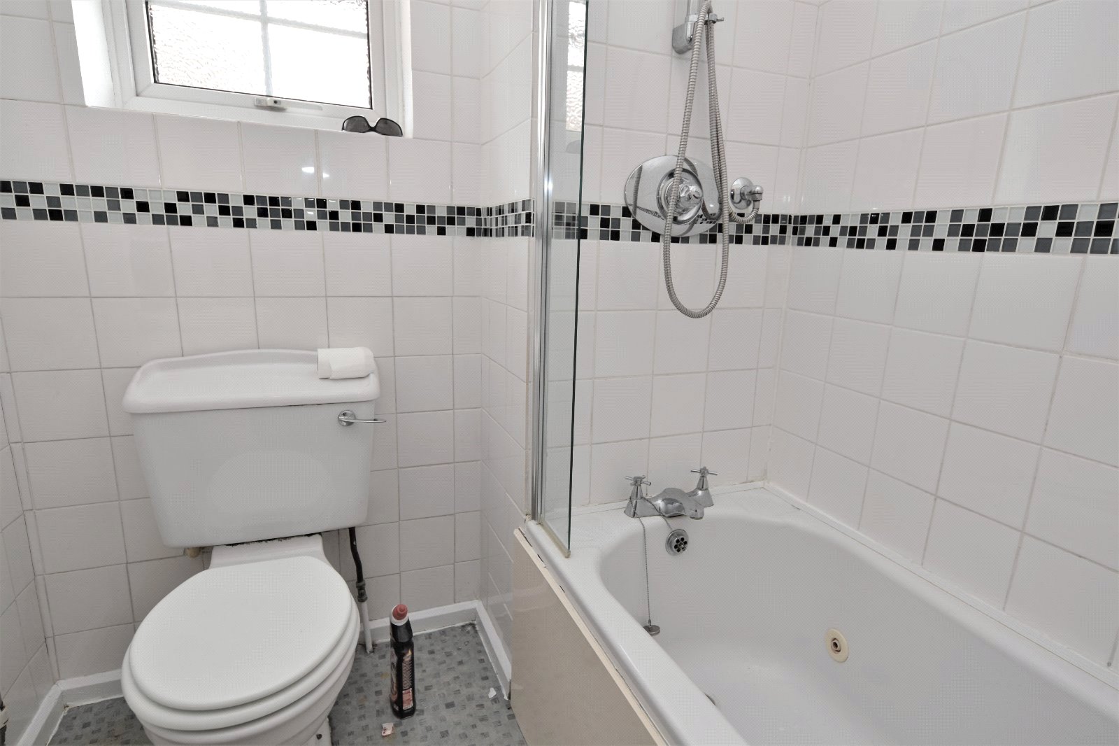 Obscure uPVC 'Georgian style' double glazed window to side aspect. The white three piece suite comprises panelled enclosed bath with mixer tap over with integrated shower over, vanity wash hand basin with mixer tap and storage cupboards under and low level flush wc. Tiling to all visible walls with border tile inlay. Radiator.