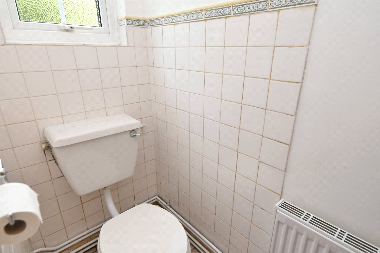 High level obscure uPVC 'Georgian style' double glazed window to rear aspect. Tiled flooring. Partly tiled walls. Radiator. The two piece suite comprises low level flush wc and corner suspended wash hand basin. Textured ceiling.