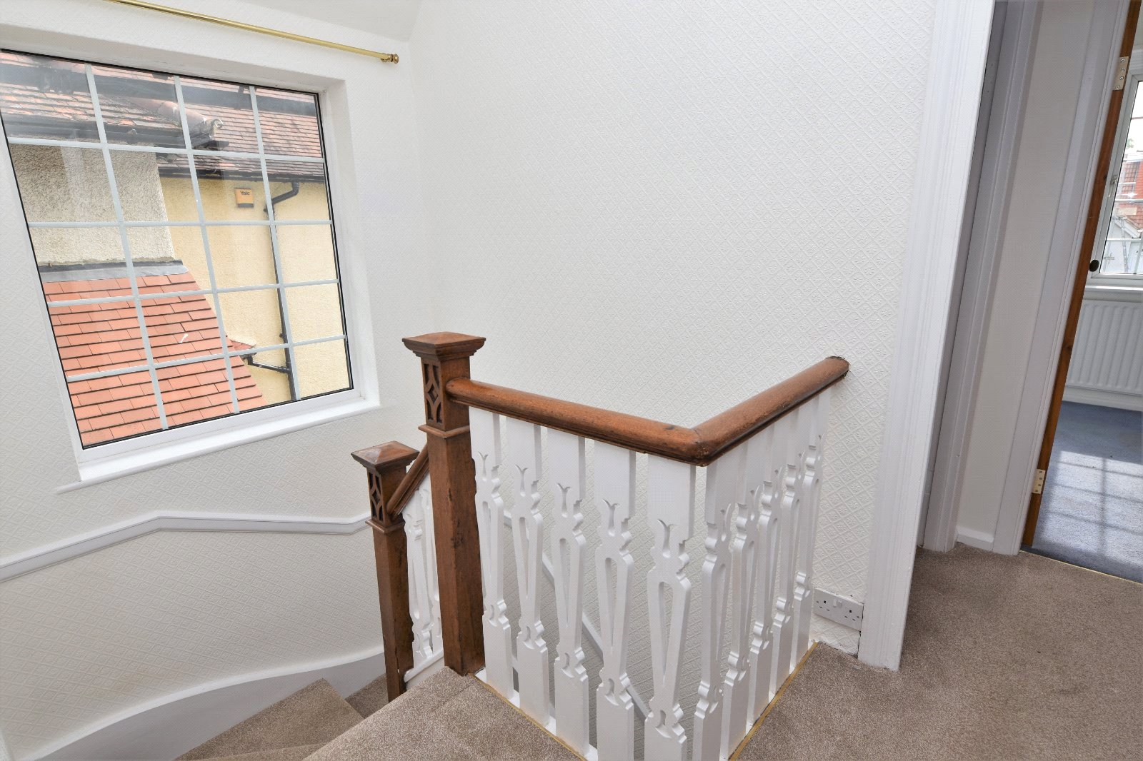 Approached via turned staircase with spindle balustrade and oak handrail. Large uPVC 'Georgian style' double glazed window to side aspect. Dado rail. Stripped panelled doors to all first floor rooms. Pair of door to built in cupboard/storage. Papered ceiling with access to loft space.