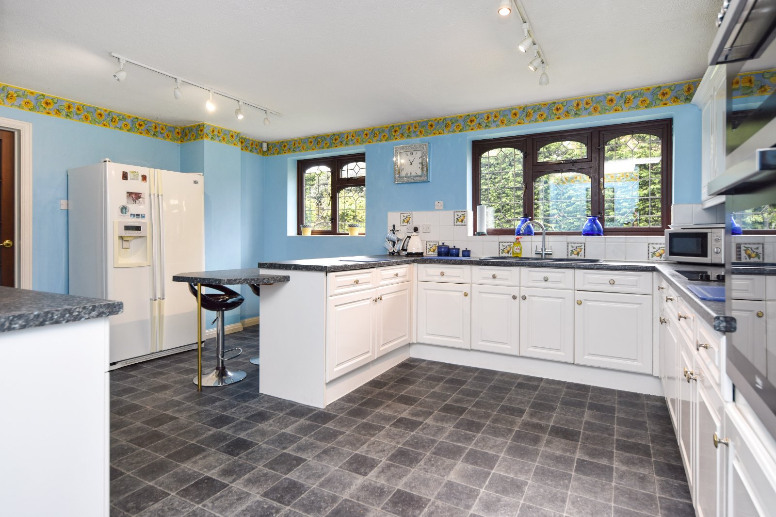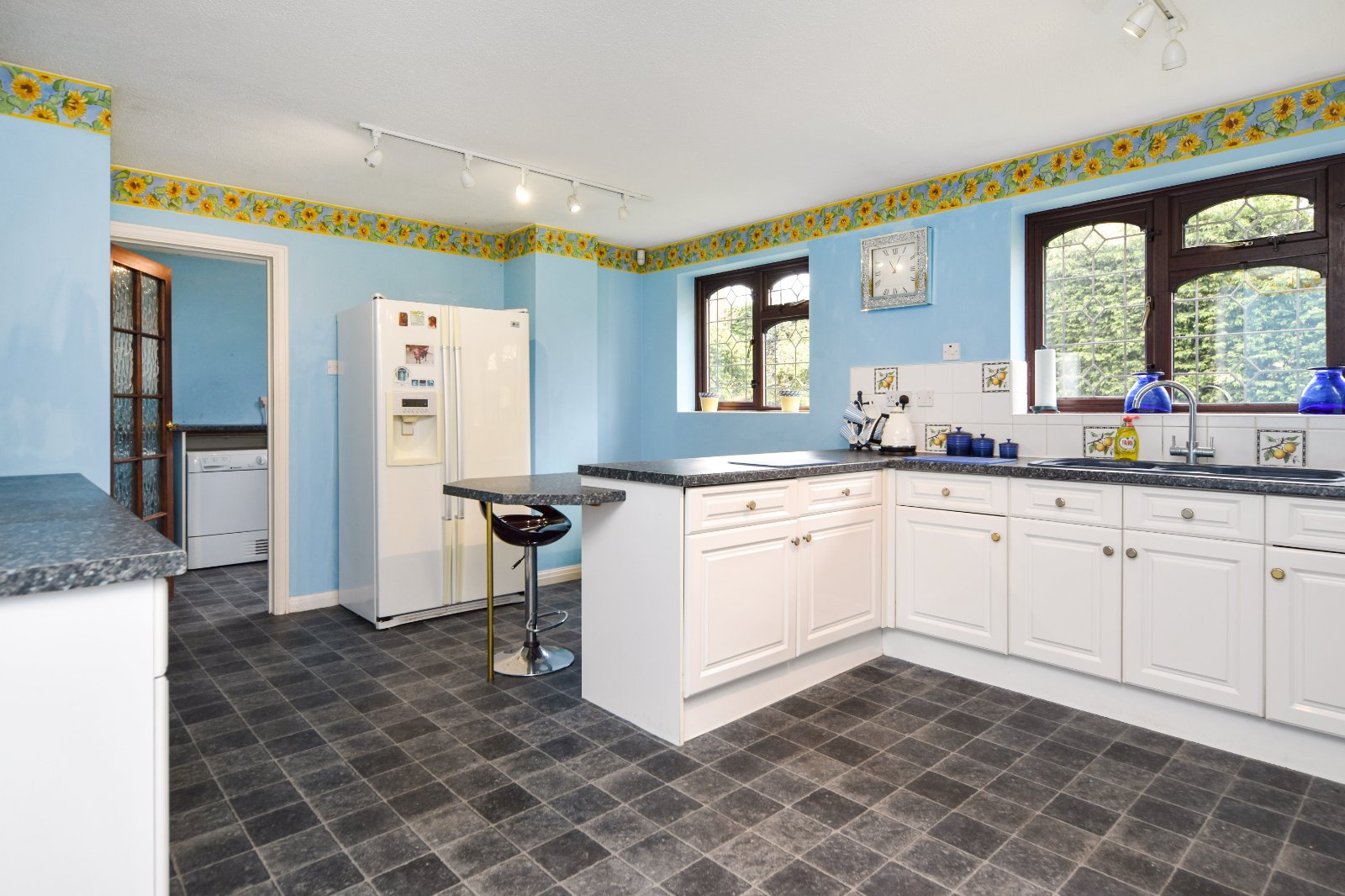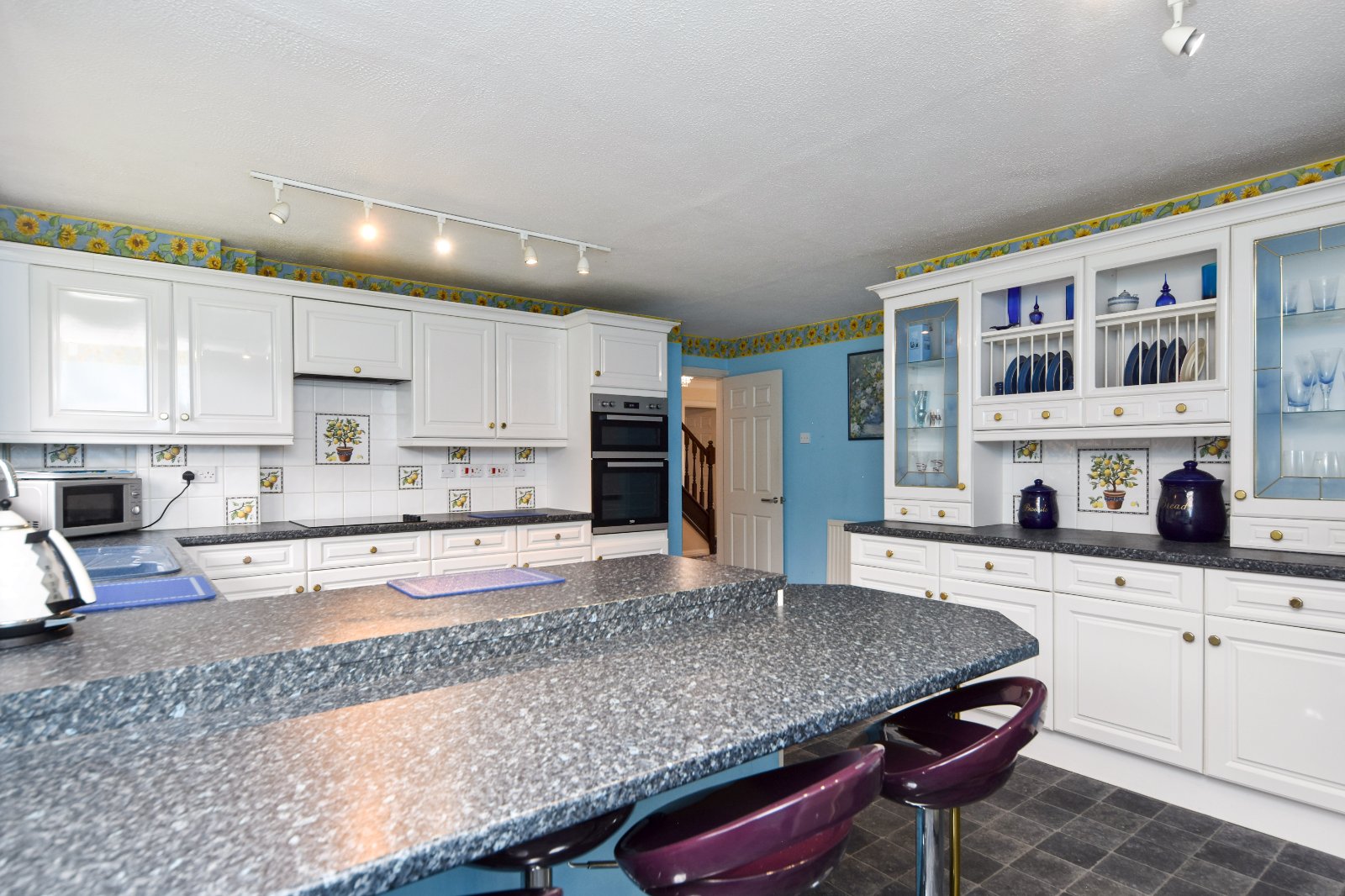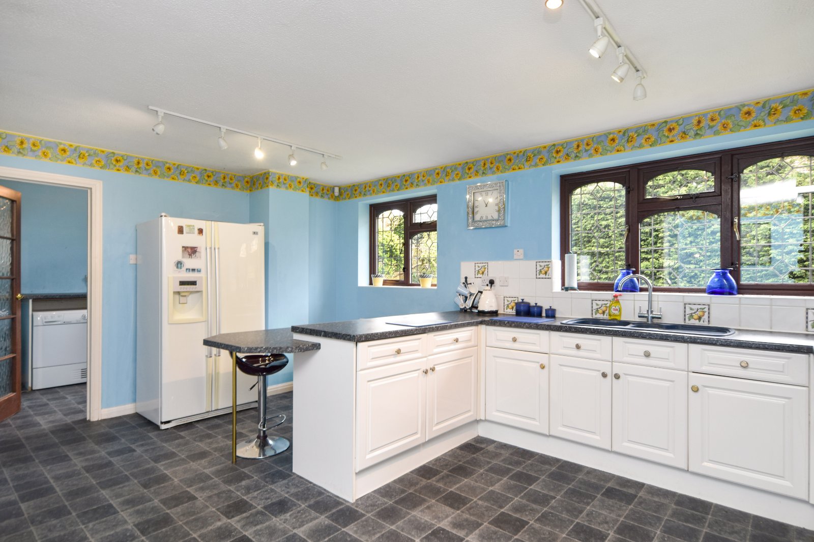 Pair of uPVC double glazed leaded windows to rear aspect. The Kitchen is fitted with a range of eye and level units with working surfaces over inset with one and quarter single drainer sink unit with mixer tap over. Built in eye level 'Beko' double oven with split level 'Hotpoint' four ring electric hob and concealed extractor fan over. Under counter integrated fridge and freezer. Splashback tiling. The worksurface area extends to provide a large breakfast bar seating area to one aspect. Various glass fronted display cabinets. Two radiators. Textured ceiling. Obscure multi pane glazed door provides access to;