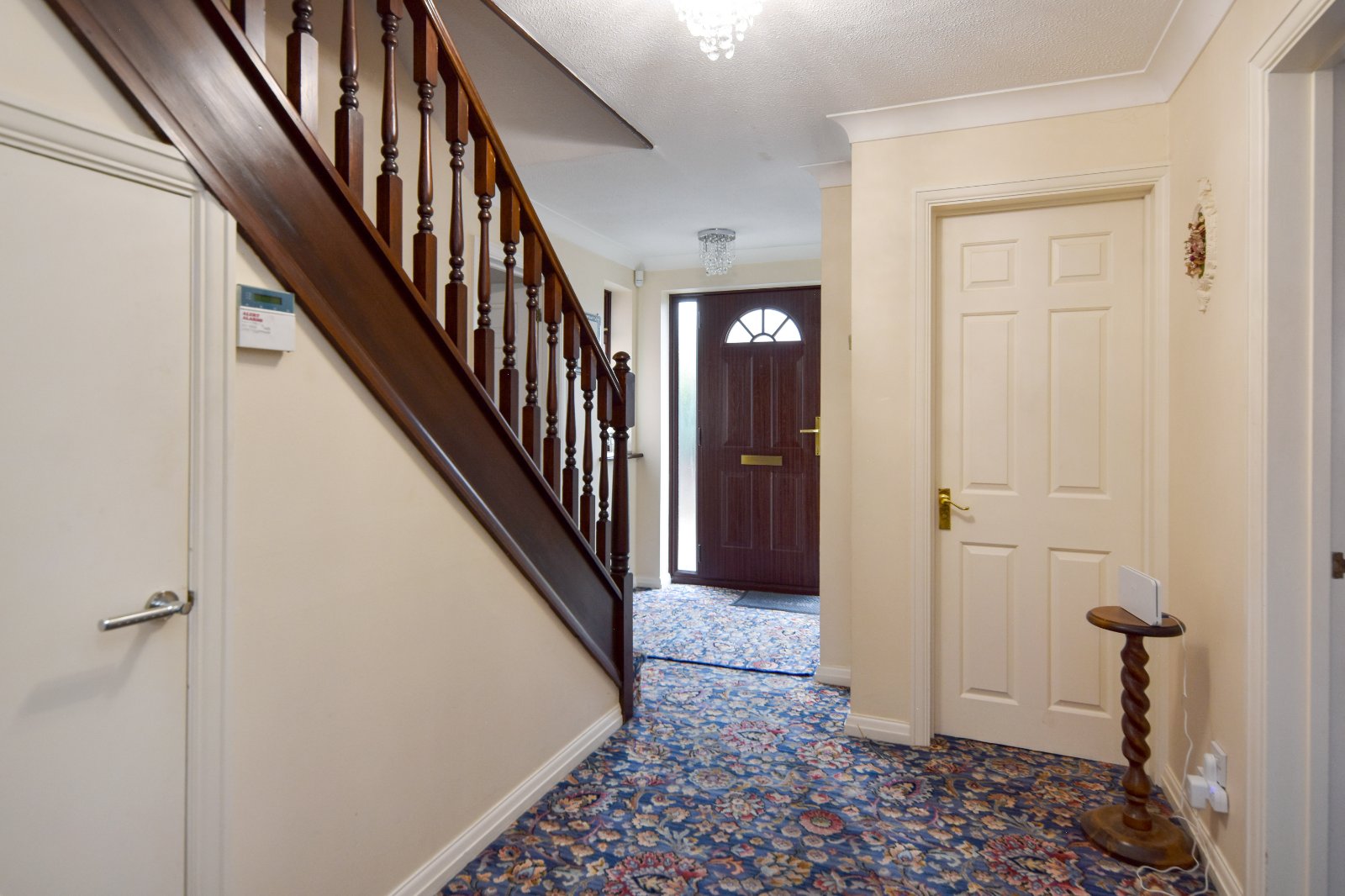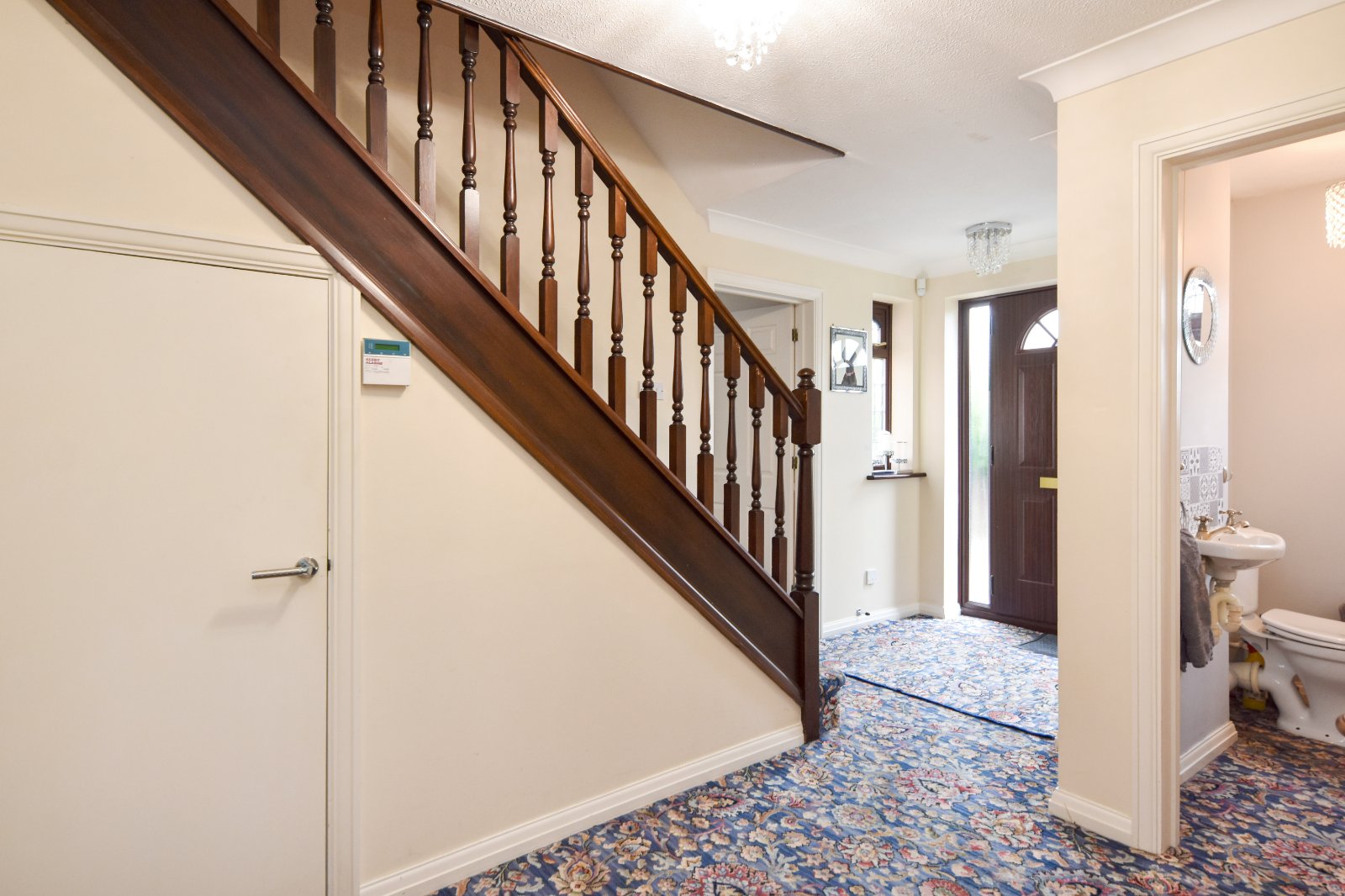 uPVC double glazed leaded window to side aspect. Stairs rising to first floor accommodation with spindle balustrade with door to under-stairs storage cupboard. Radiator. Thermostat control panel. Panelled doors to Living Room, Kitchen, Dining Room and Home Office/Games Room. Coving to textured ceiling. Further panelled door to;