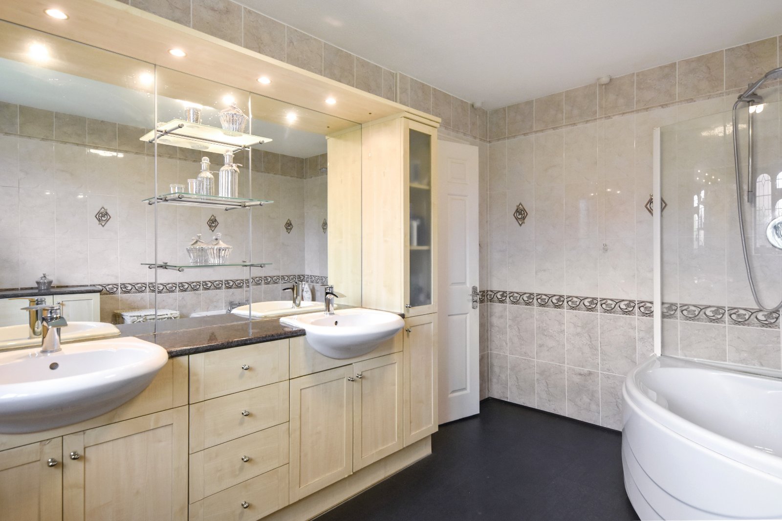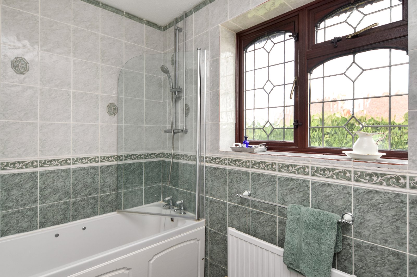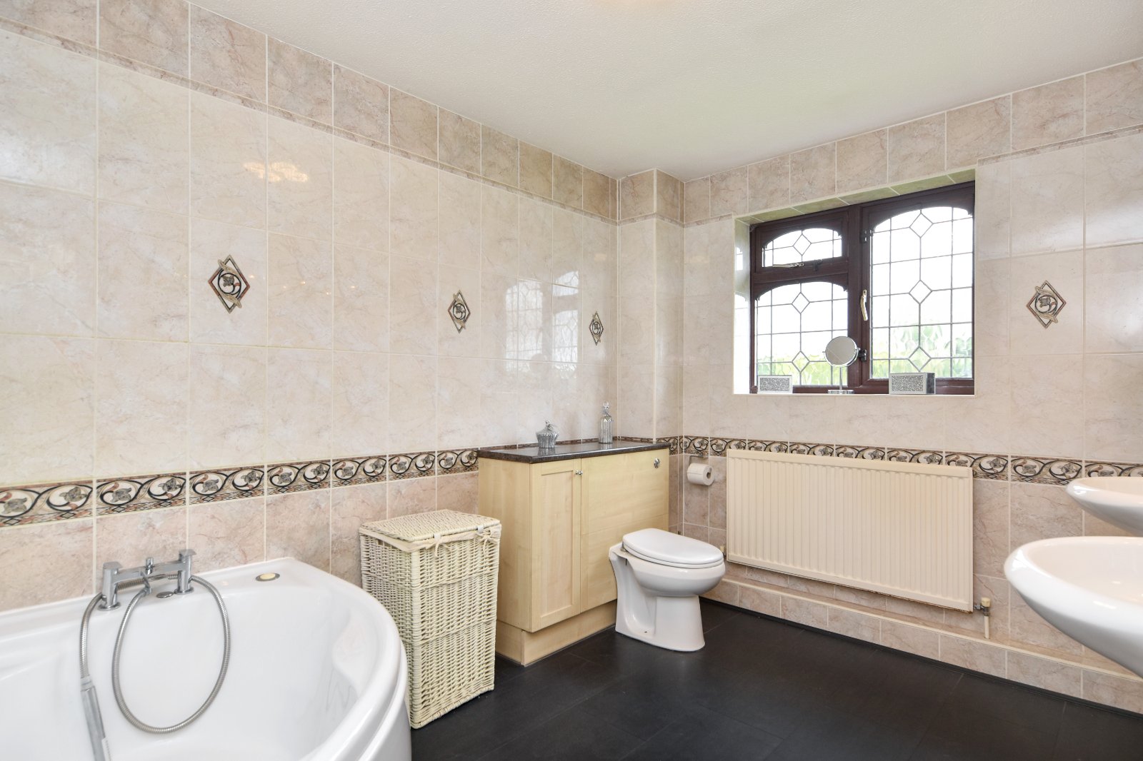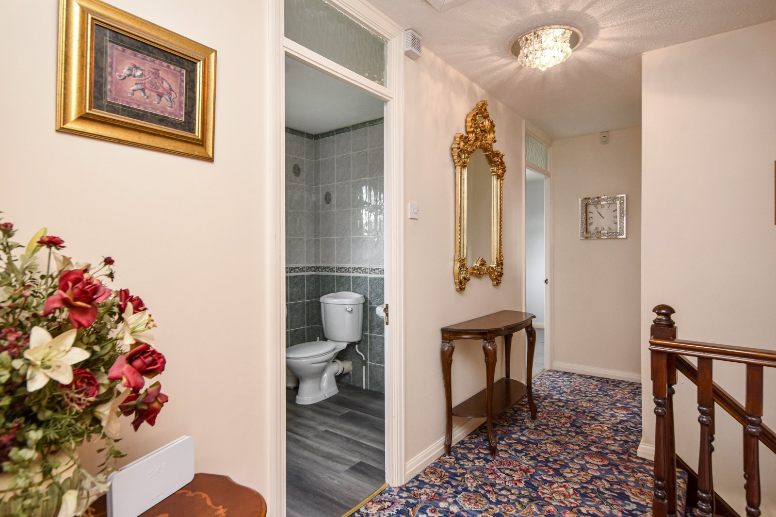Obscure uPVC double glazed leaded window to rear aspect. The fully tiled bathroom comprises a generous size jacuzzi style corner bath with mixer taps and shower attachment with further integrated shower over and fitted curved shower screen. Concealed cistern WC with storage cupboard and vanity shelf over. Fitted vanity unit to one aspect incorporating a pair of 'tallboy' storage cupboards to with end with worksurface area inset with a pair of vanity wash hand basins with mixer tap over, inset with mirror backplate with pelmet over inset with recessed lighting. Further storage cupboards and drawer stack under. Radiator. Textured ceiling.