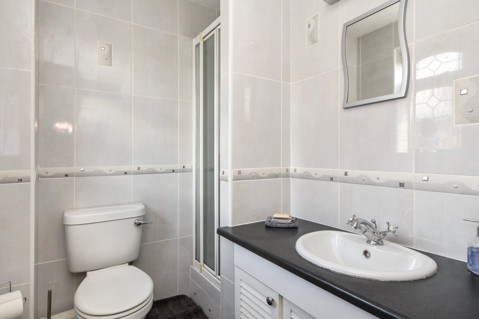 Obscure uPVC double glazed leaded window to front aspect. The fully tiled suite comprises a recessed shower enclosure with integrated shower unit, low level flush wc and vanity unit to one aspect incorporating a wash hand basin with mixer tap over and storage cupboards under. Radiator. Textured ceiling.