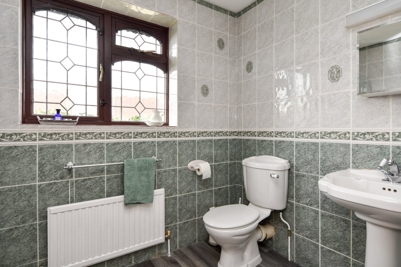 Obscure uPVC double glazed leaded window to front aspect. The two piece suite comprises low level flush wc and suspended wash hand basin. Splashback tiling. Radiator. Textured ceiling.
