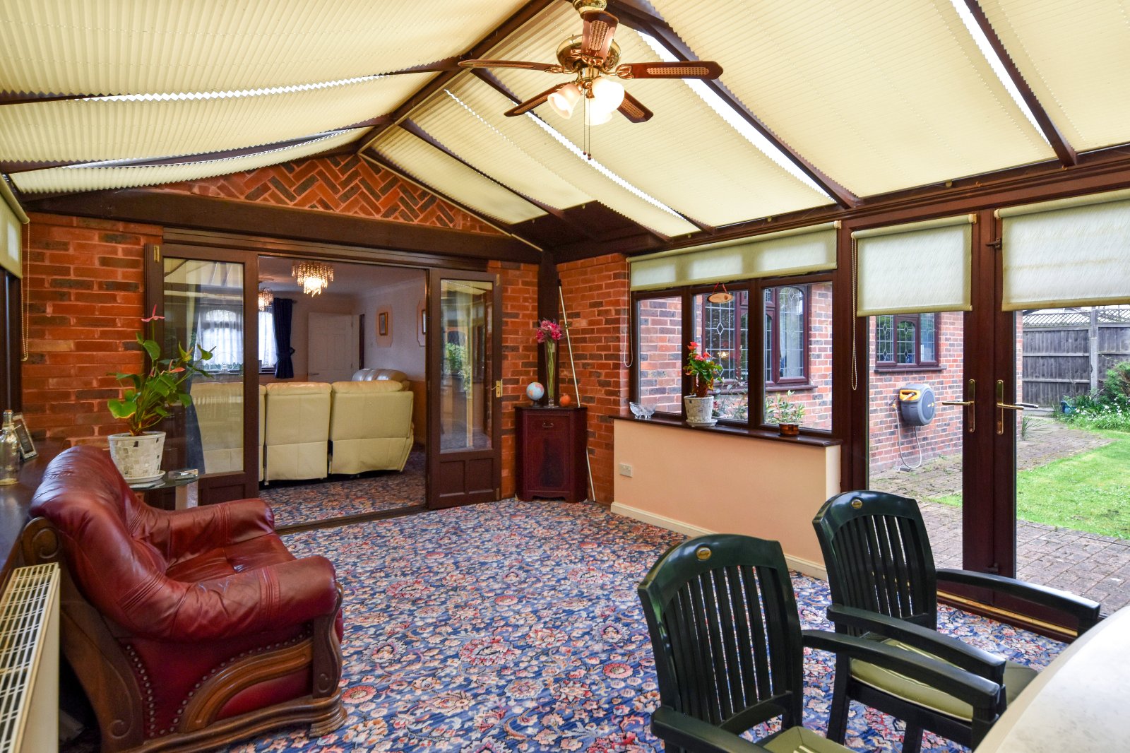 Double glazed windows to three aspects. Polycarbonate pitched roofline fitted with blinds and ceiling mounted light and fan. Two radiators. Pair of uPVC double glazed doors providing access to Garden.